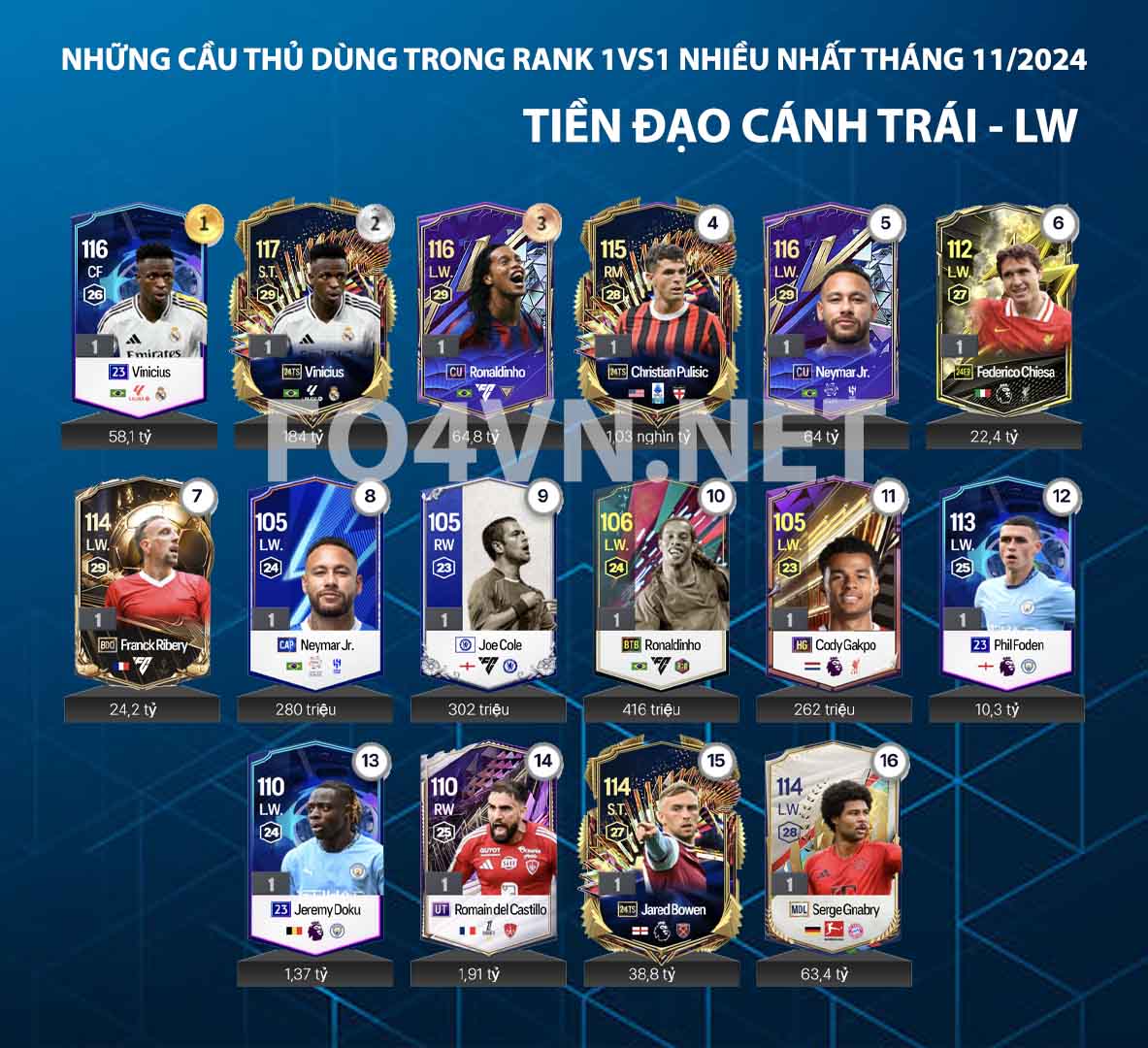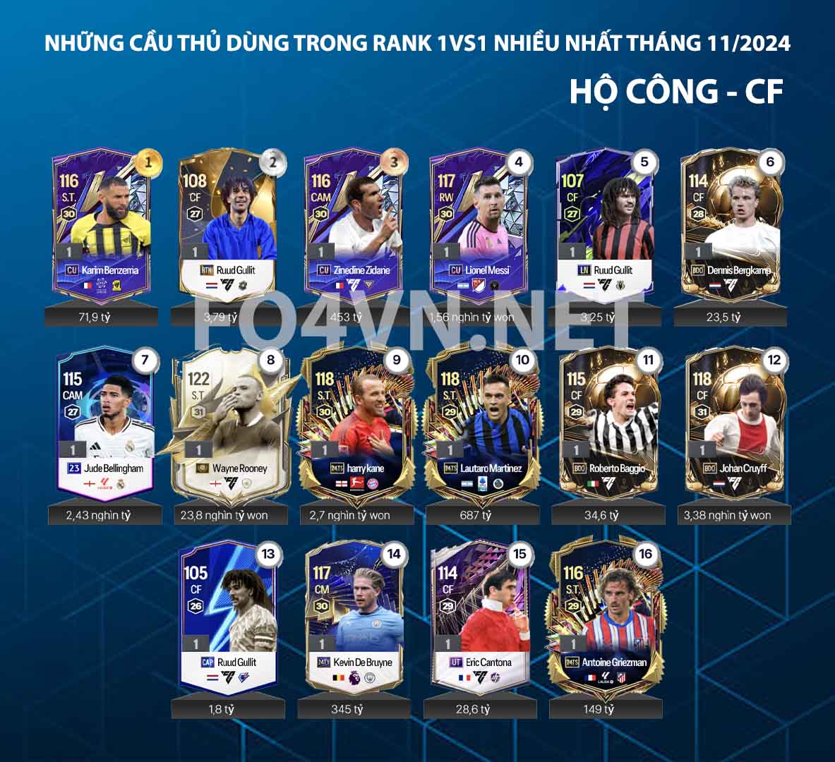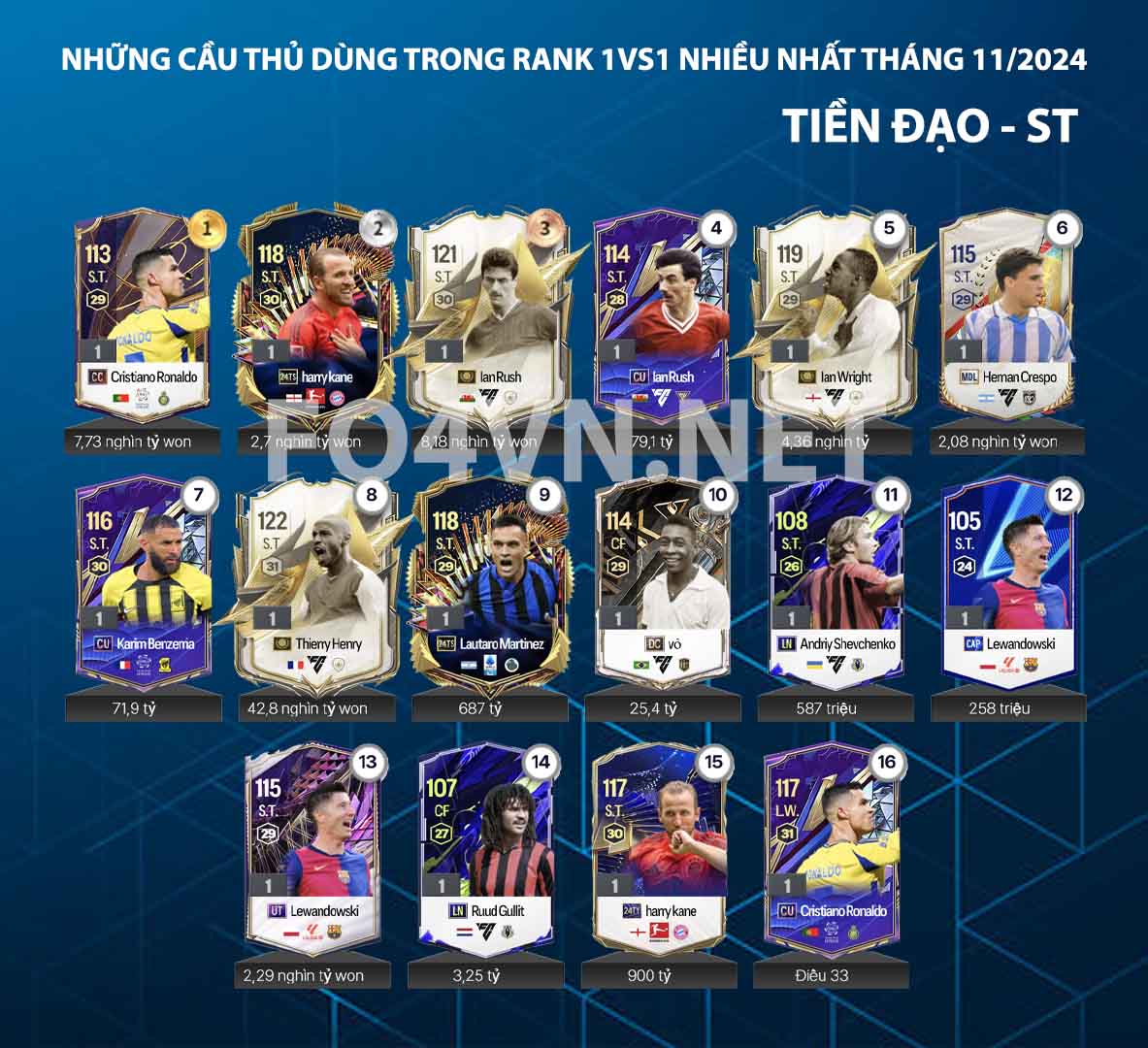 Hôm nay, hãy cùng tìm hiểu những cầu thủ được dùng nhiều nhất FC Online tháng 11/2024 cho vị trí tiền đạo ở bài viết dưới đây