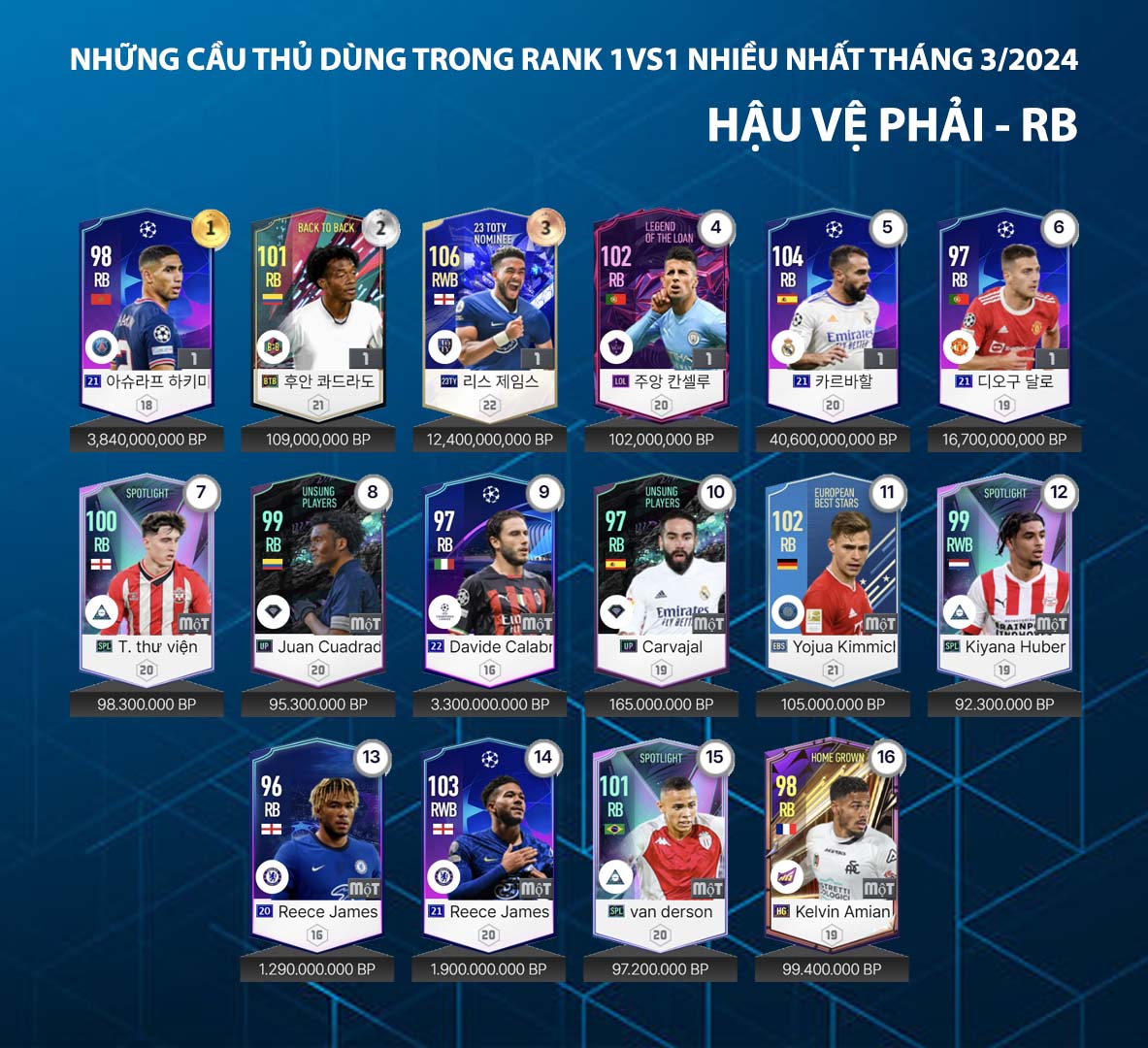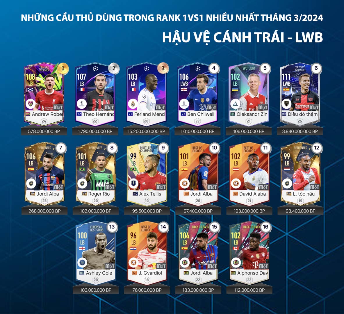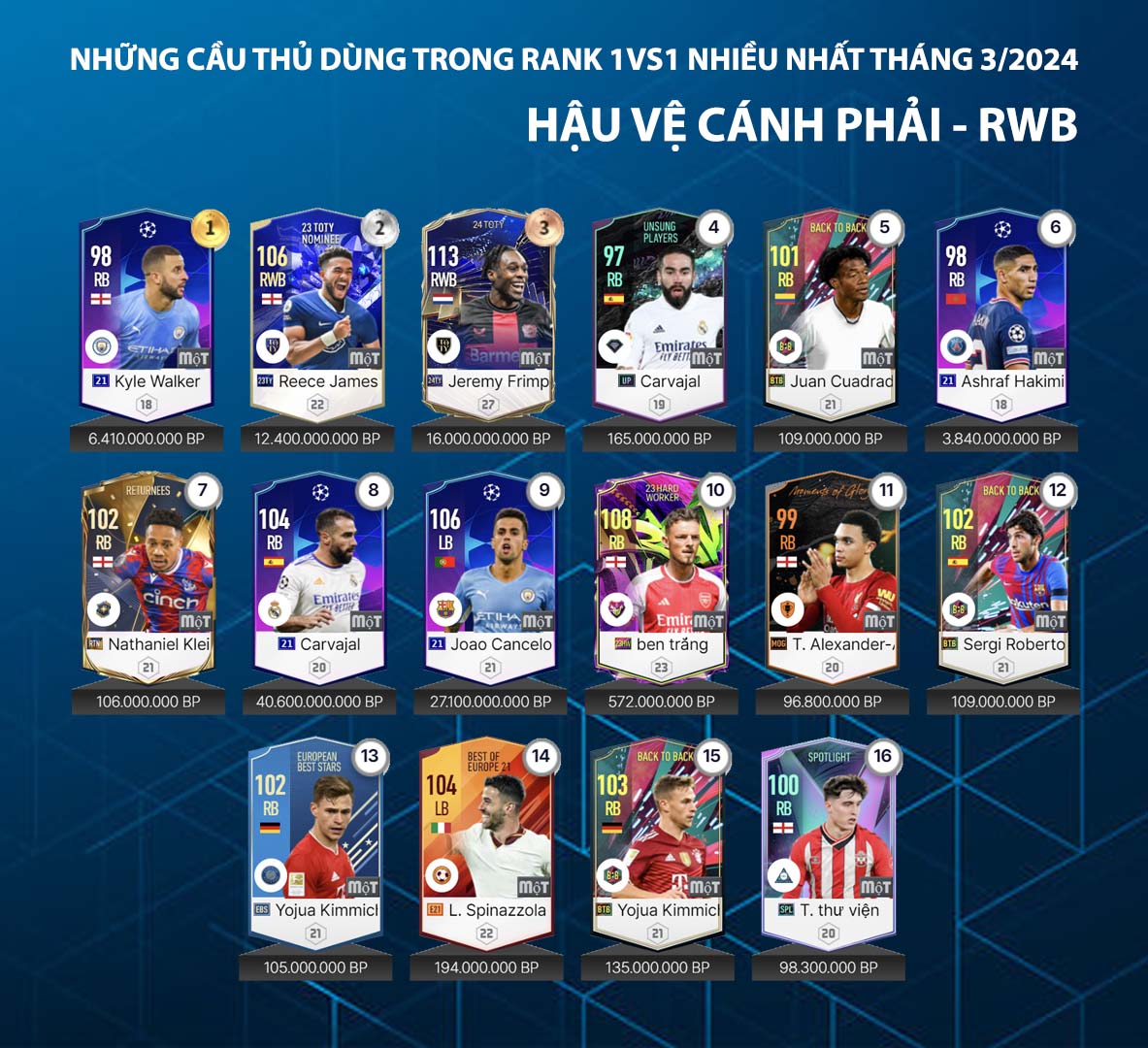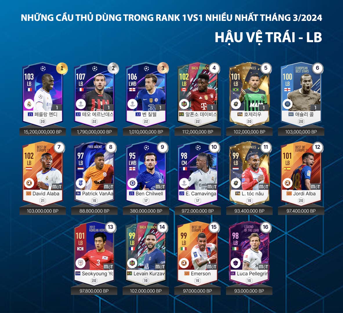 Danh sách dưới đây được thống kê từ máy chủ về những cái tên được sử dụng nhiều nhất trong tháng qua của những game thủ rank cao tại máy chủ xếp hạng. Đây được xem là một trong những nội dung tham khảo đáng quan tâm và fo4vn.net hôm nay gửi tới cho các bạn danh sách những hậu vệ và thủ môn được sử dụng nhiều nhất trong tháng 3.