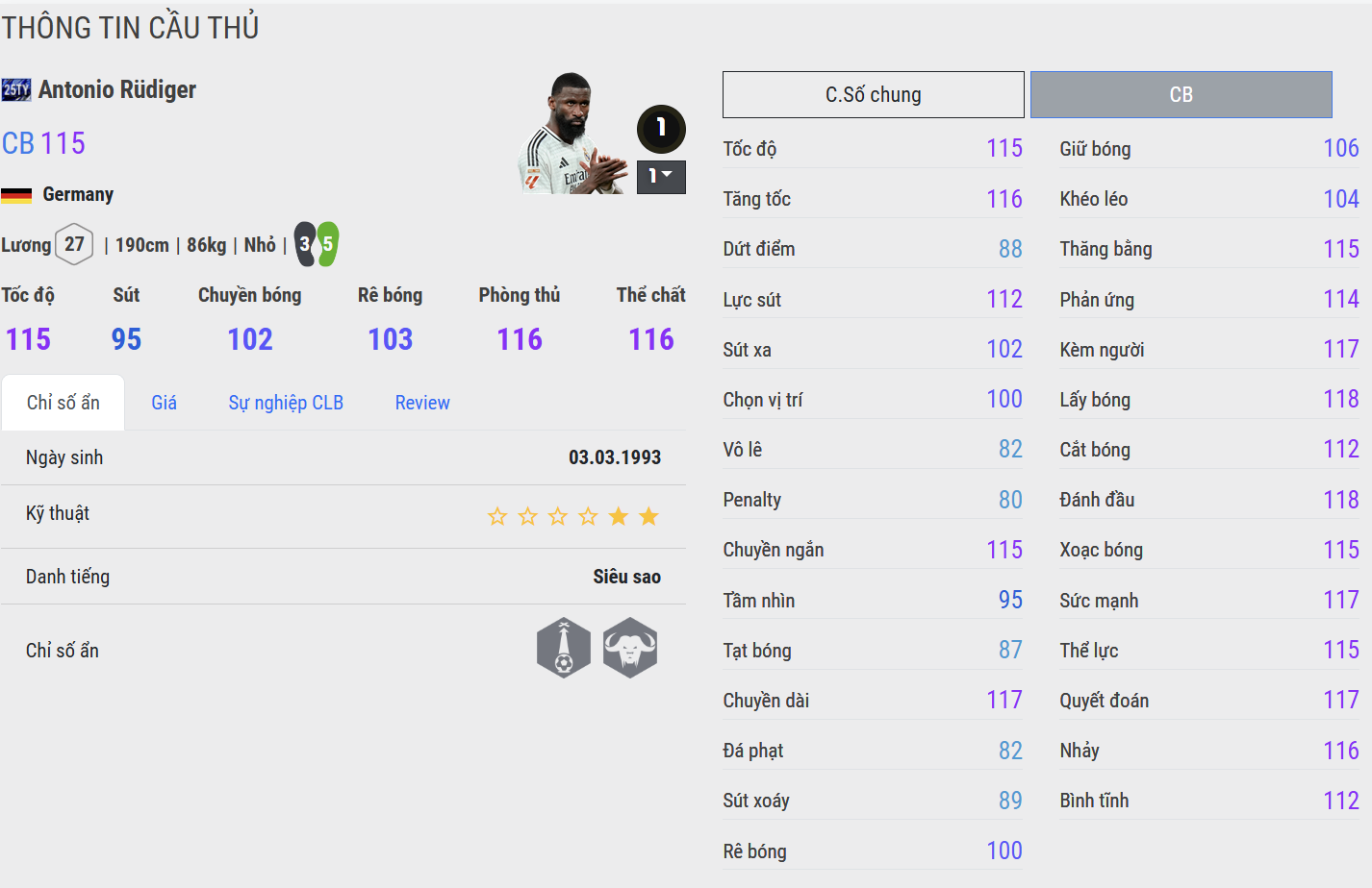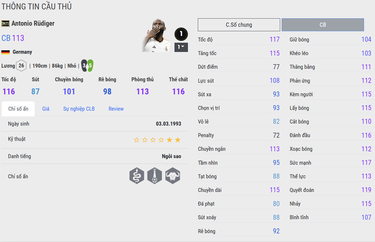 Khả năng di chuyển cắt bóng của Rudiger cũng có một vài điểm nổi bật hơn ở mùa 25TY so với 24TS. Ngoài AI di chuyển khôn, động tác tắc bóng, chọc chân lấy bóng của Rudiger 25TY cũng cho chút cảm giác nhanh và dứt khoát hơn kha khá.