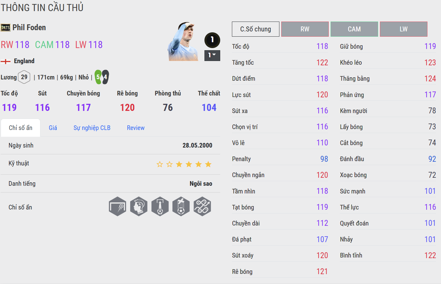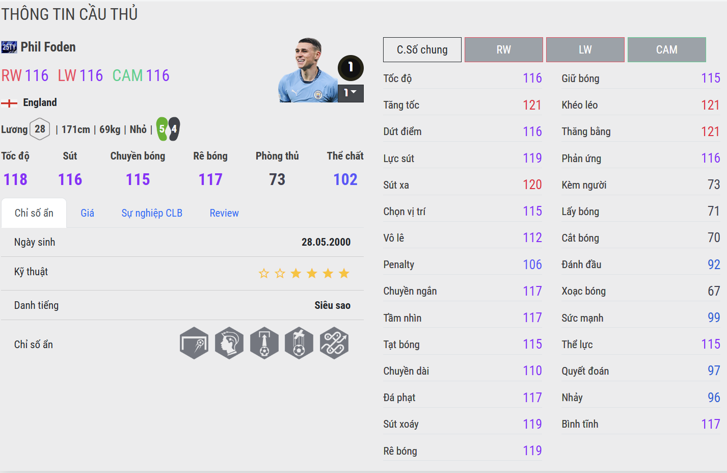 Là viên ngọc sáng giá nhất mà lò Man City từng sản sinh, Phil Foden kết hợp hài hòa giữa sự tinh tế của một “số 10” cổ điển và tốc độ – kỹ thuật hiện đại của một cầu thủ chạy cánh. Trong FC Online, 24TS và 25TY là hai mùa giải được sử dụng nhiều nhất nhờ sự toàn diện ở vị trí CAM, LW hoặc LAM. Vậy đâu là phiên bản tối ưu hơn cho đội hình của bạn, hãy cùng tìm hiểu ở bài viết dưới đây.