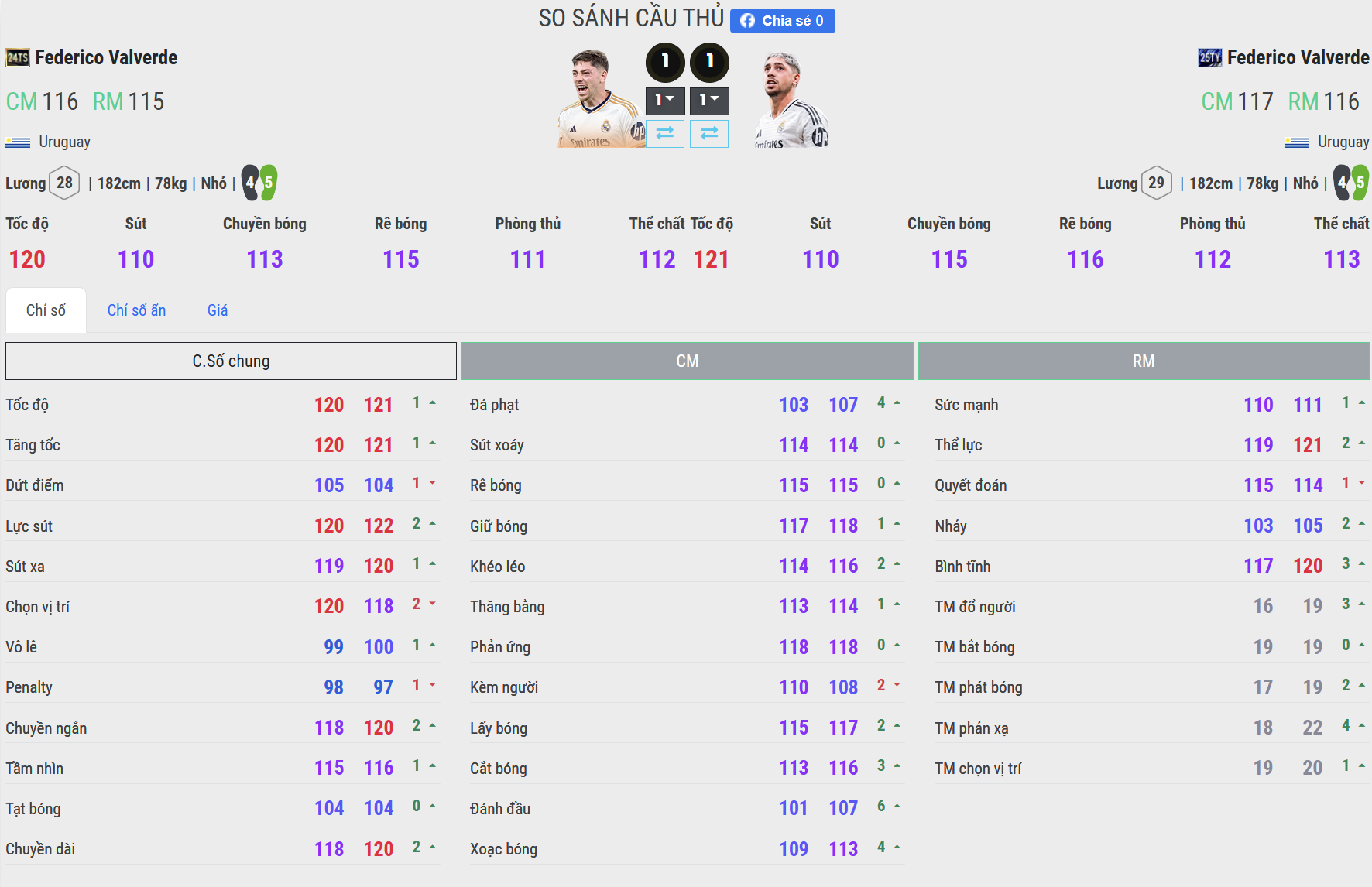 Valverde sở hữu chỉ số thể chất tốt, chuyền bóng ổn định và phòng ngự ấn tượng, giúp anh trở thành một lựa chọn lý tưởng cho tuyến giữa. Những mùa thẻ mạnh như 25TY, 24TS, 24TY... đều có chỉ số cao, giúp Valverde trở thành một trong những tiền vệ box-to-box đáng dùng nhất trong FC Online.