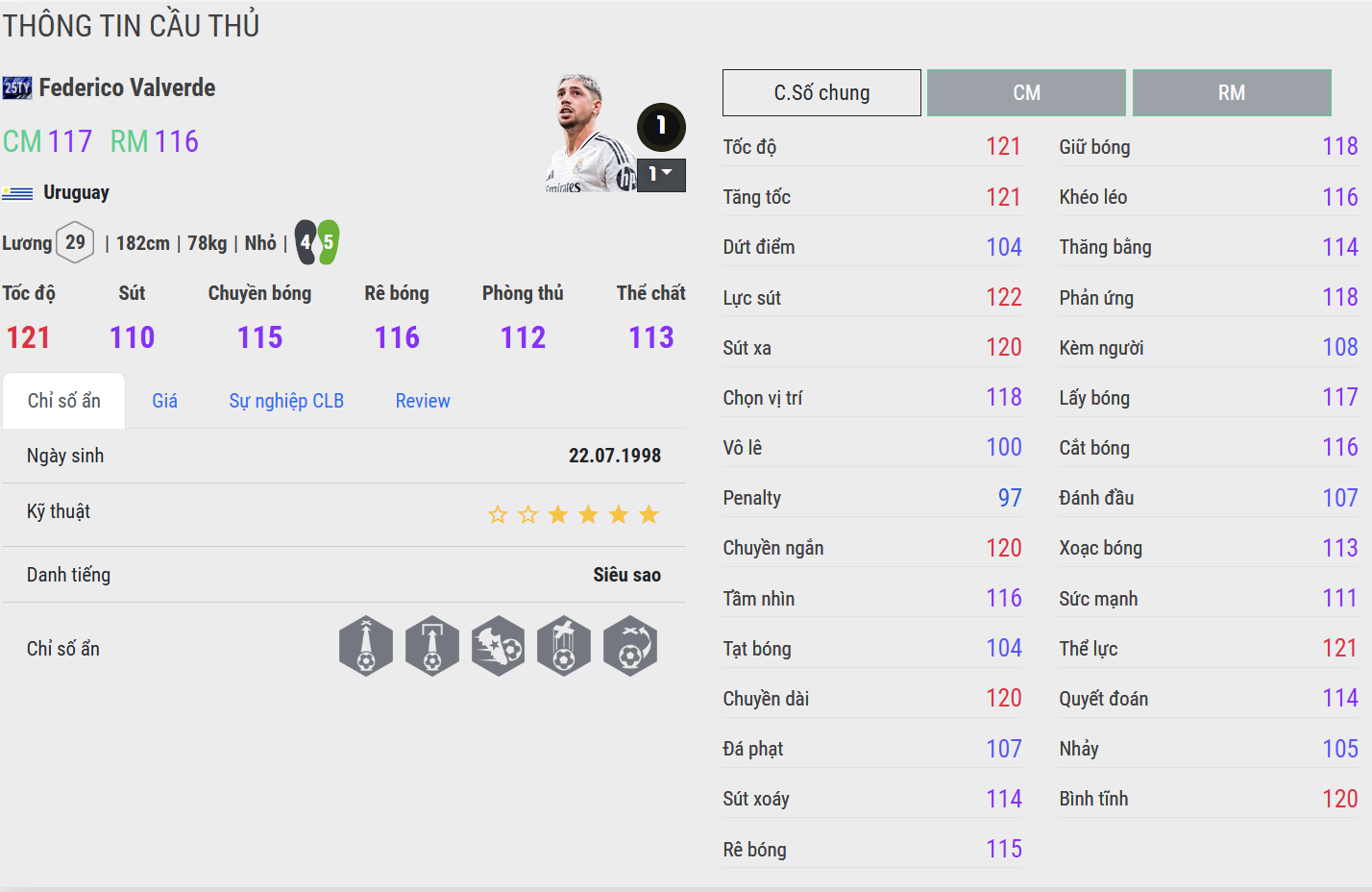 Federico Valverde trong FC Online là một tiền vệ toàn diện, nổi bật với tốc độ, thể lực dồi dào và khả năng sút xa uy lực. Anh có thể chơi tốt ở nhiều vị trí như CM, RM, CDM, phù hợp với lối đá pressing cường độ cao hoặc phản công nhanh.