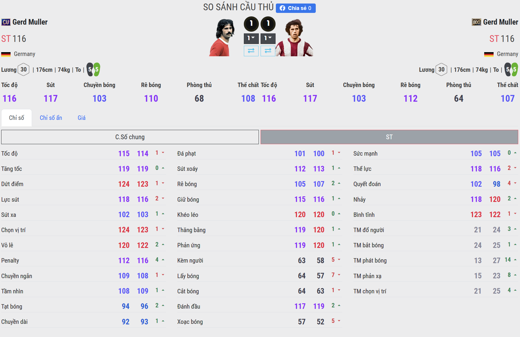 Tốc độ của cả 2 phiên bản này không có quá nhiều khác biệt, Dù có thể hình to và không có ma tốc độ nhưng khả năng tăng tốc của Gerd Muller lại rất ấn tượng đặc biệt là khi có thêm chỉ số ẩn đỡ bước 1. Điều này giúp cho các tình huống đua tốc quãng ngắn được cải thiện đáng kể.