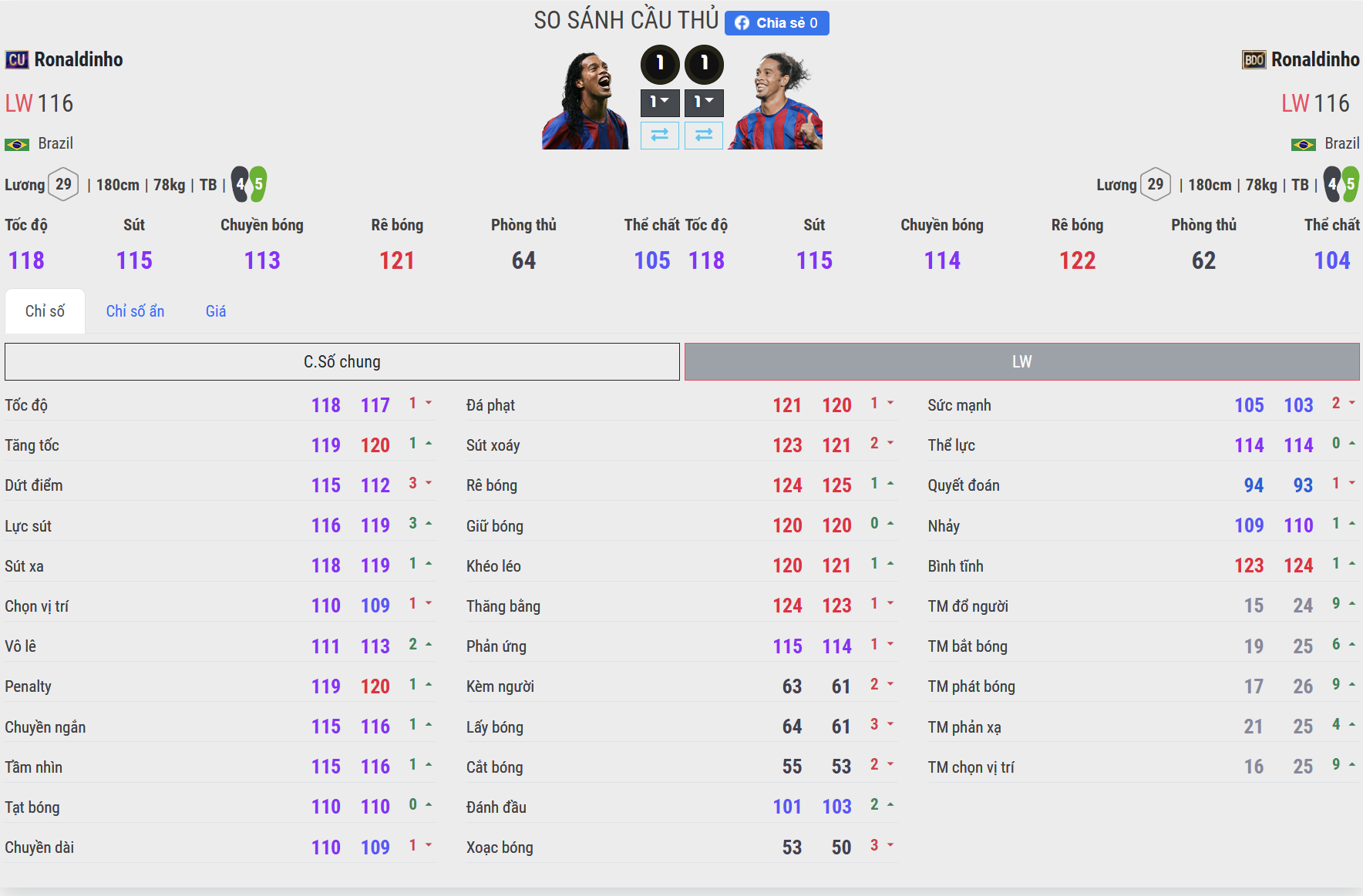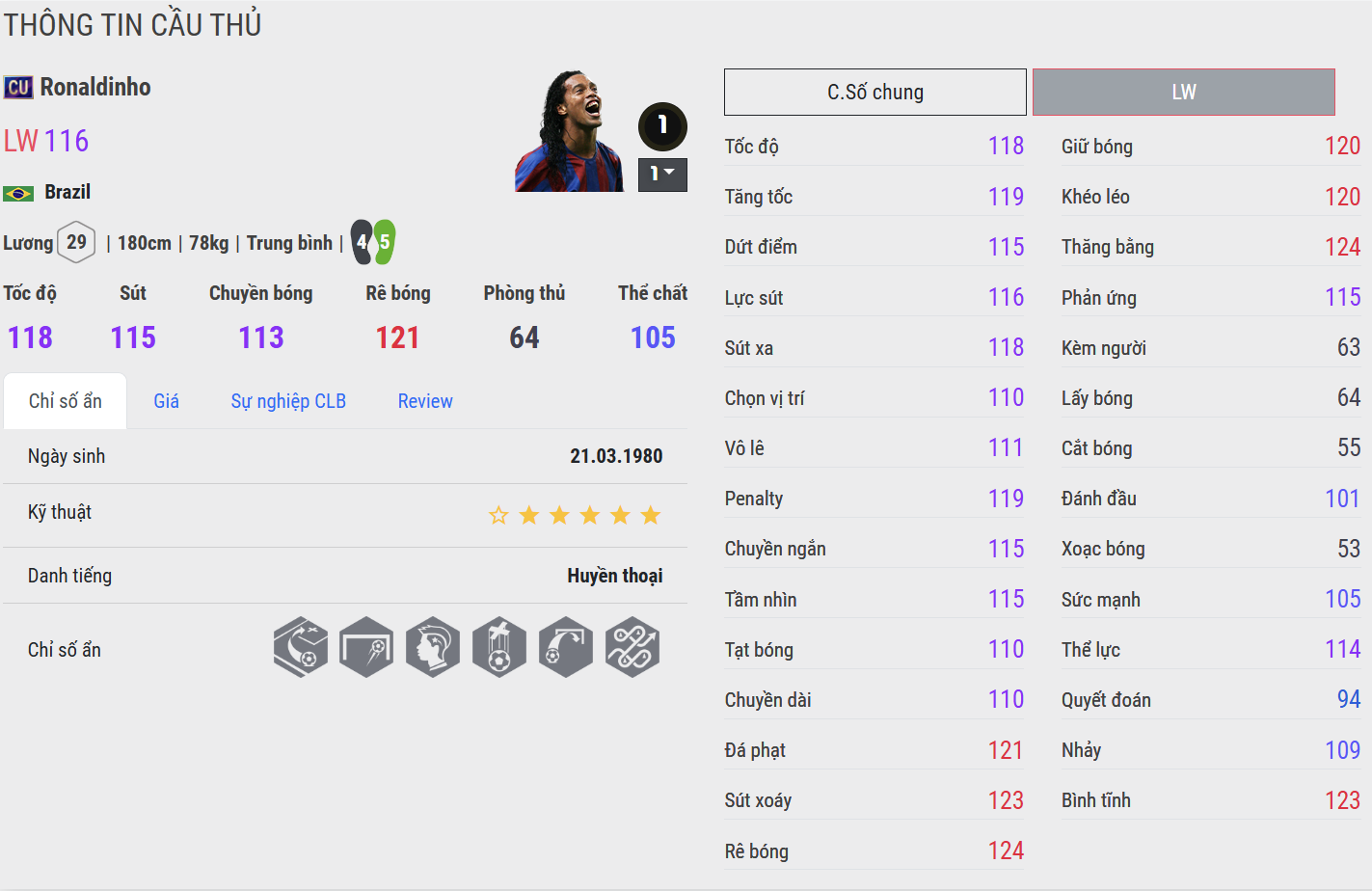 Ronaldinho là một trong những tiền vệ tấn công cực kì chất lượng của FC Online. Anh sở hữu tốc độ ổn, kỹ thuật nổi bật cùng khả năng chuyền bóng tinh tế và chơi được nhiều vị trí khác nhau cả ở vai trò tiền đạo cánh lẫn tiền vệ tấn công.