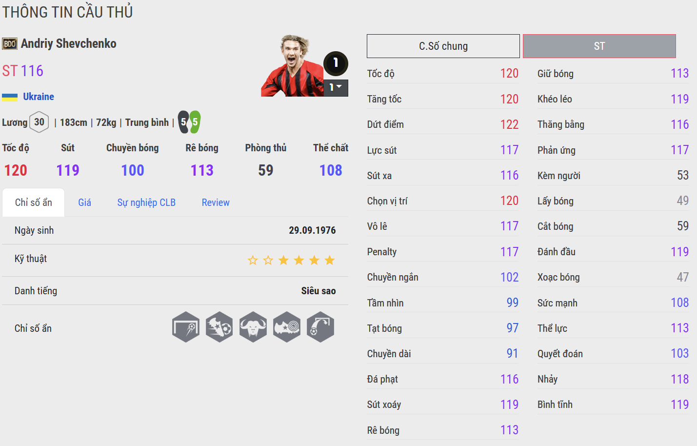 Andriy Shevchenko luôn được xem là một trong những tiền đạo cắm đa năng và đáng dùng trong FC Online ở thời điểm hiện tại. Anh sở hữu kỹ năng dứt điểm cực kì đa dạng cùng với đó là sở hữu nhiều team color chất lượng.