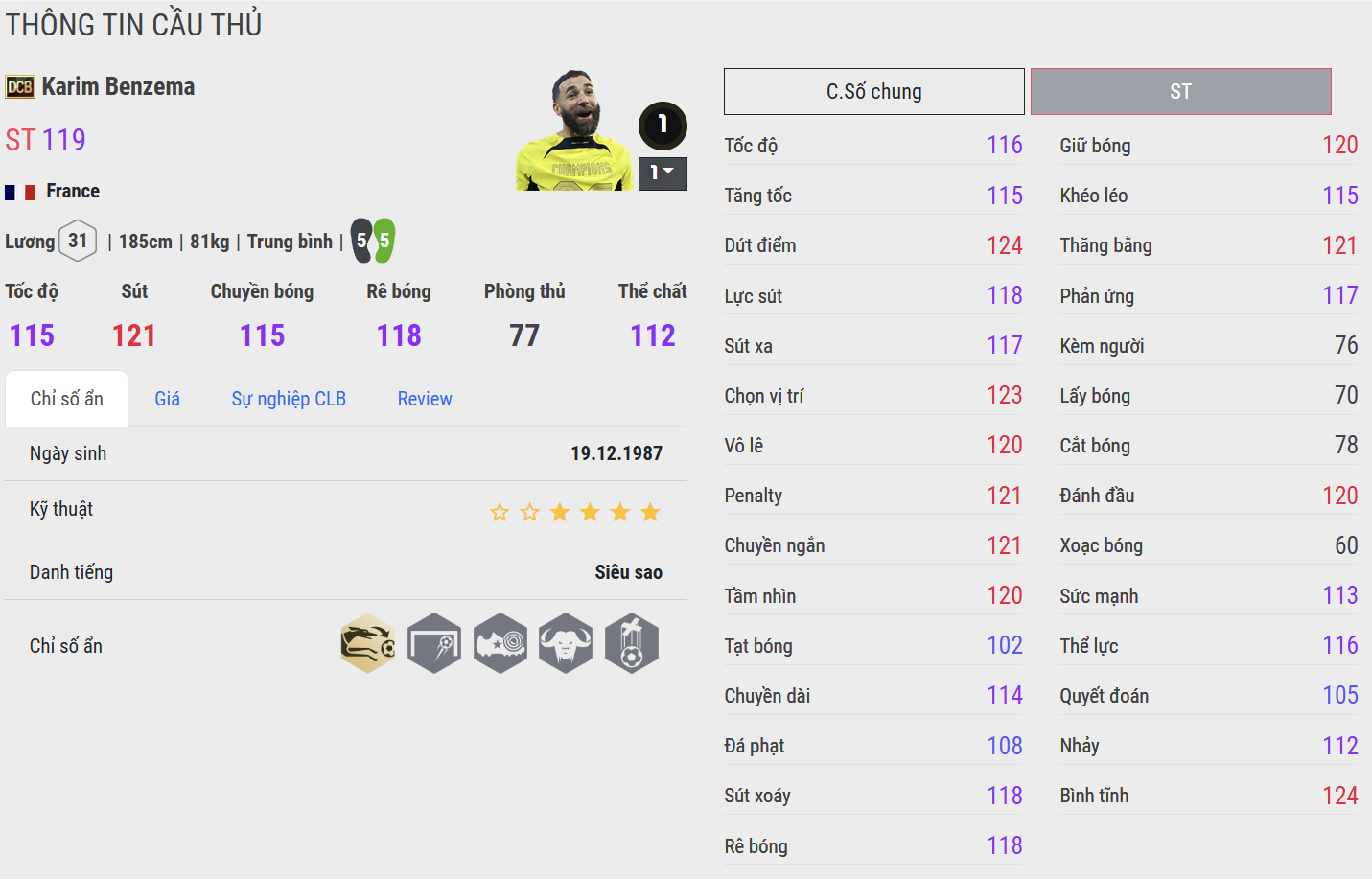 Benzema mùa 25TS có tốc độ vừa phải, không quá nổi bật nhưng đủ để xoay trở và thoát pressing trong phạm vi ngắn. Anh thiên về di chuyển thông minh hơn là bứt tốc thuần túy. Trong khi đó, mùa DCB lại cải thiện rõ rệt về tốc độ, đặc biệt là bước chạy đầu tiên nhanh và khả năng tăng tốc đường dài ổn định hơn. Điều này giúp Benzema DCB có thể tự tin bứt lên trong các tình huống phản công hoặc thoát kèm khi đối đầu với trung vệ nhanh. Nếu 25TS phù hợp lối chơi chậm rãi, phối hợp nhóm thì DCB lại đa dụng hơn trong cả tấn công nhanh lẫn kiểm soát bóng.