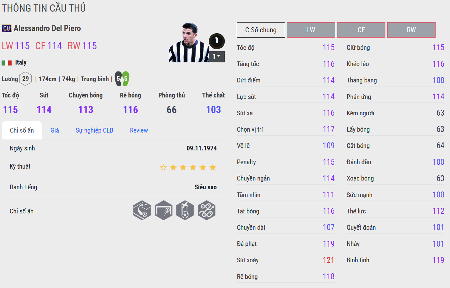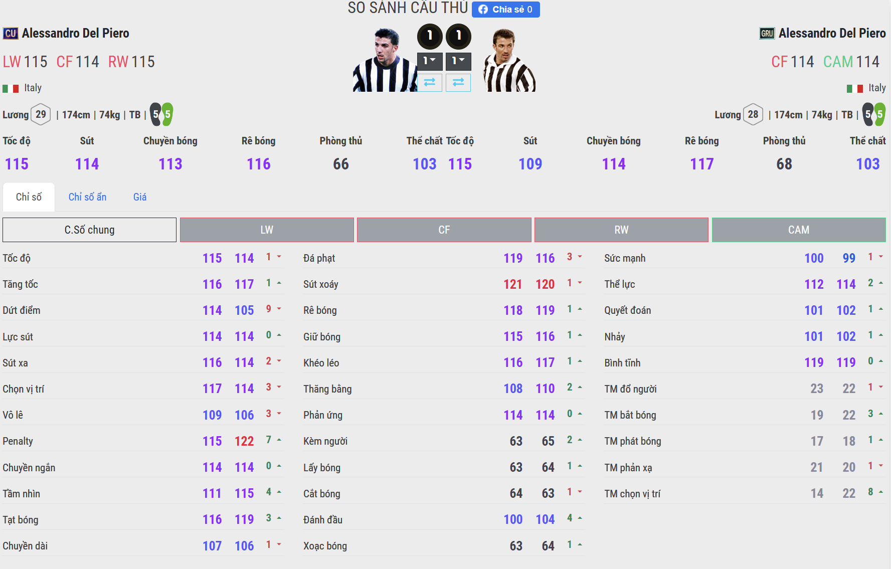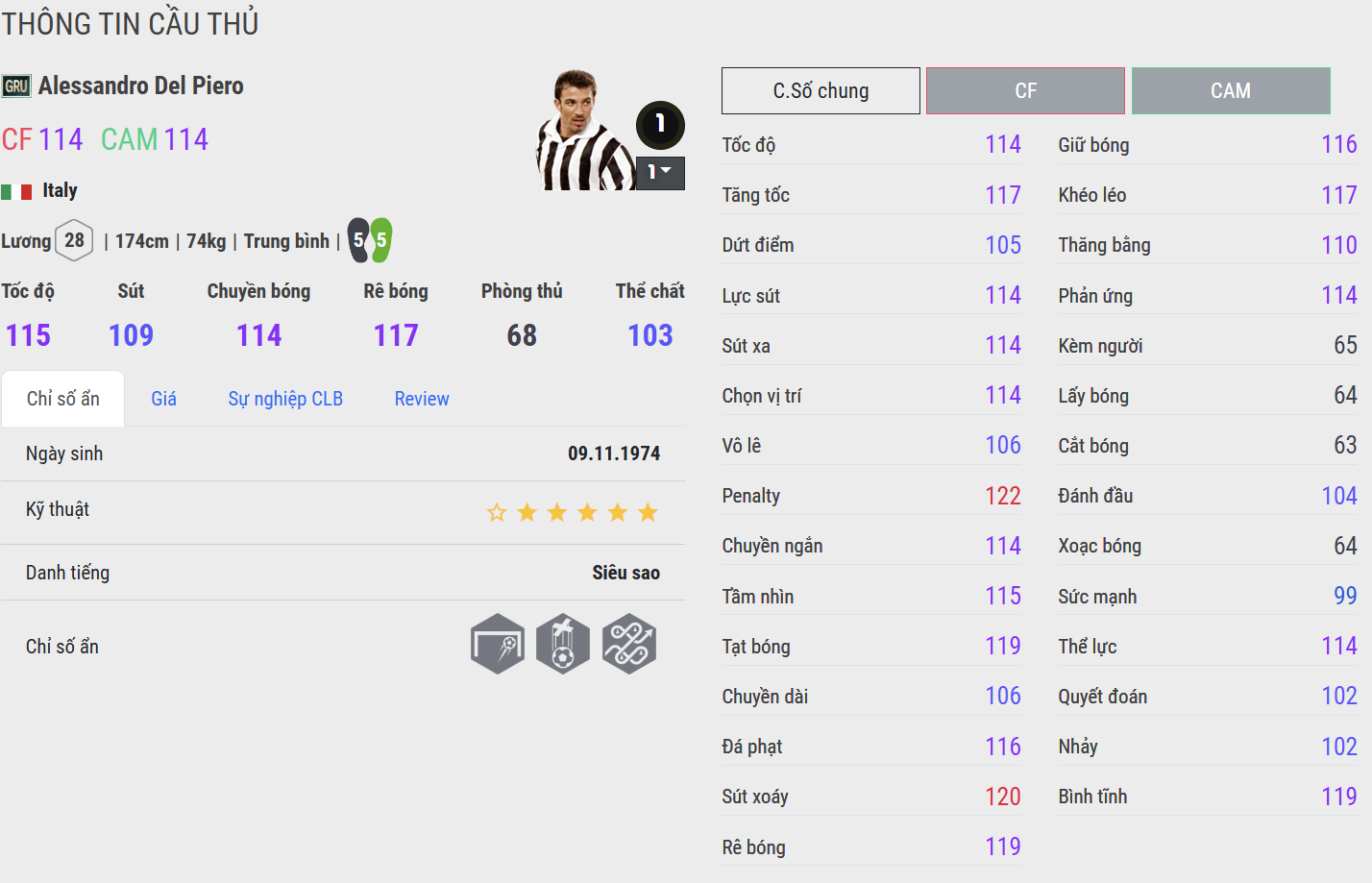 CU nhỉnh hơn nhẹ, GRU đủ dùng. Dù không thuộc mẫu cầu thủ thiên về tốc độ, Del Piero mùa CU cho cảm giác nhanh nhẹn hơn đôi chút, đặc biệt là những pha bứt tốc ngắn hoặc thoát pressing ở biên. Trong khi đó, GRU có phần chậm rãi hơn, nhưng vẫn đủ dùng trong các sơ đồ đá thấp như CAM hoặc CF.