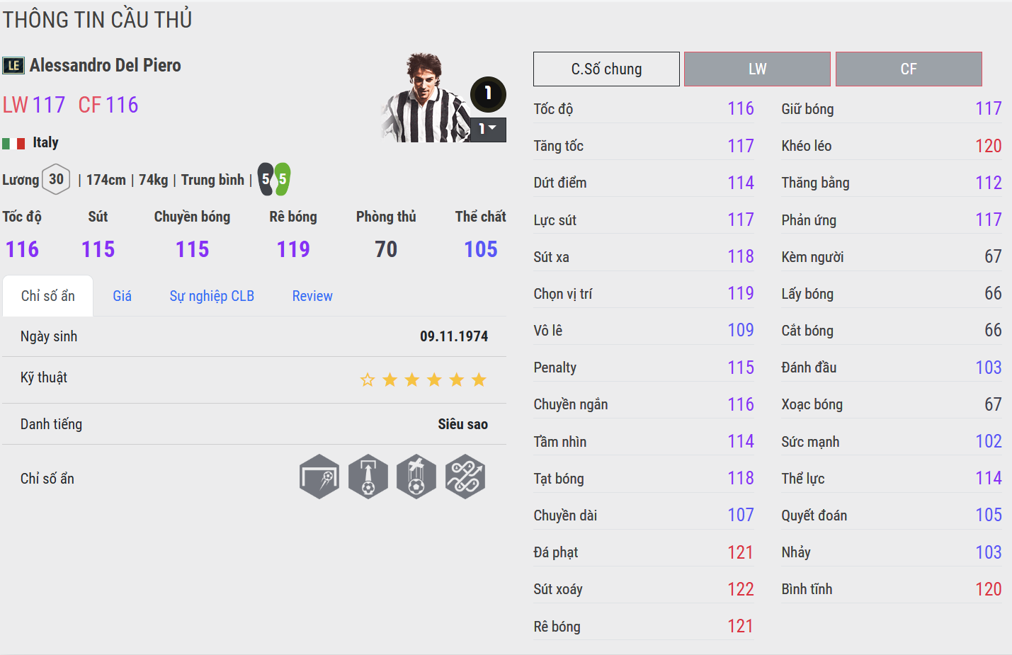 LE: Toàn diện hơn hẳn, lực sút mạnh hơn, chân không thuận ổn hơn và tỷ lệ thành bàn cao hơn trong nhiều tình huống. Đây là phiên bản khiến Del Piero trở thành mũi công chủ lực thực sự.