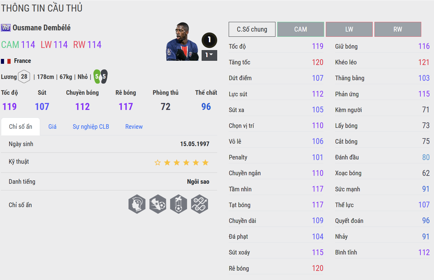 Ousmane Dembélé, sinh ngày 15 tháng 5 năm 1997 tại Vernon, Pháp, là một trong những cầu thủ chạy cánh nhanh và kỹ thuật bậc nhất thế giới hiện nay. Anh nổi bật với khả năng rê dắt tốc độ, xử lý bóng khéo léo bằng cả hai chân và tạo đột biến ở mọi tình huống.