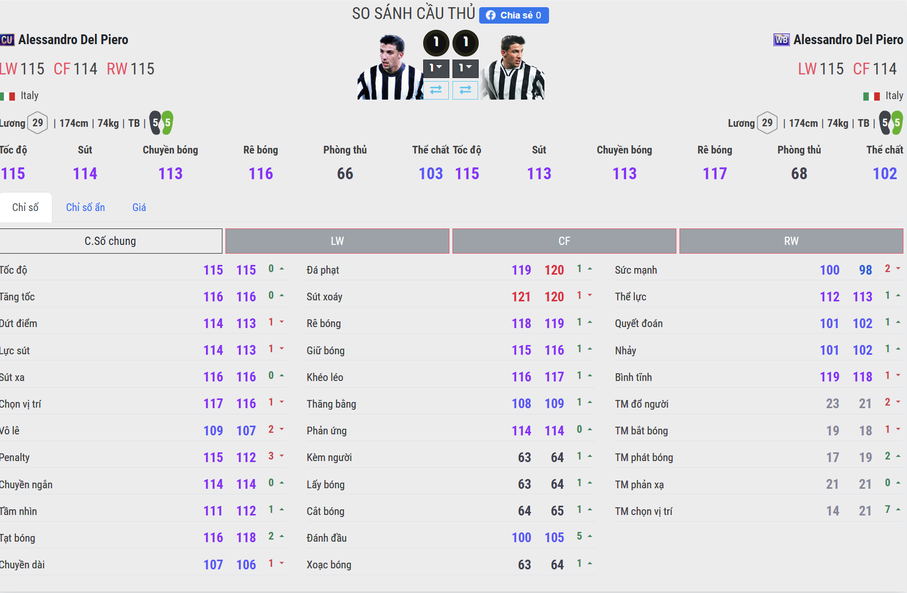 CU nhanh hơn, WB thoát pressing tốt hơn. Del Piero CU có tốc độ tăng tốc khá ấn tượng, phù hợp với những tình huống phản công hoặc ban bật nhanh. WB tuy không quá nhanh, nhưng di chuyển tinh quái, chọn vị trí lùi thấp đón bóng, nhả lại rồi lao lên đúng thời điểm.