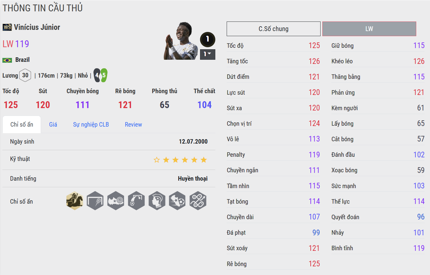 WS: Tốc độ cực nhanh, bứt tốc đầu tốt, cảm giác mượt và thanh thoát. WS Vinicius có sự linh hoạt trong từng bước chạy, phù hợp với những pha solo cánh dài.
