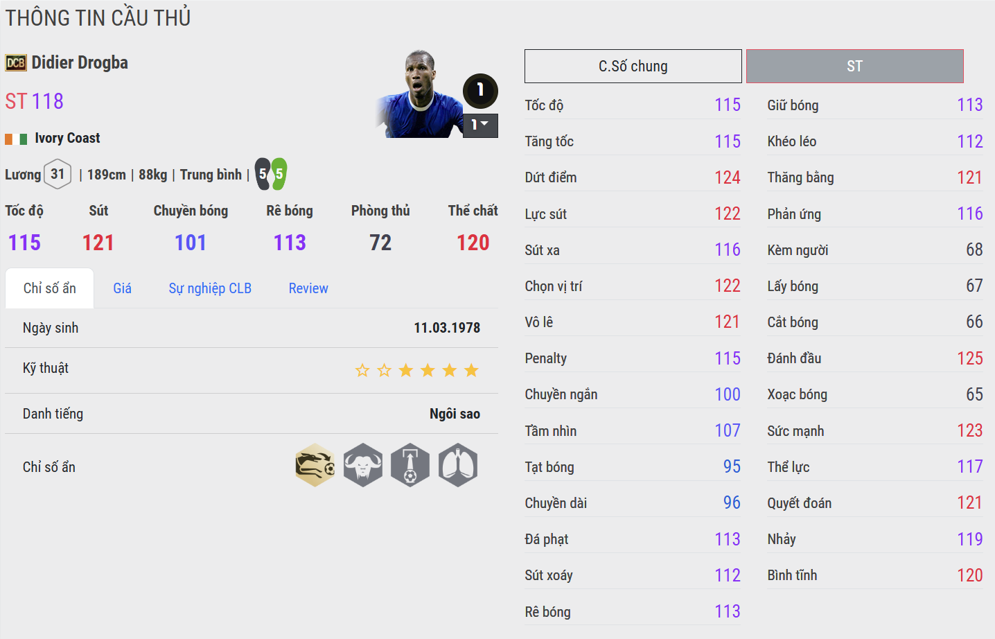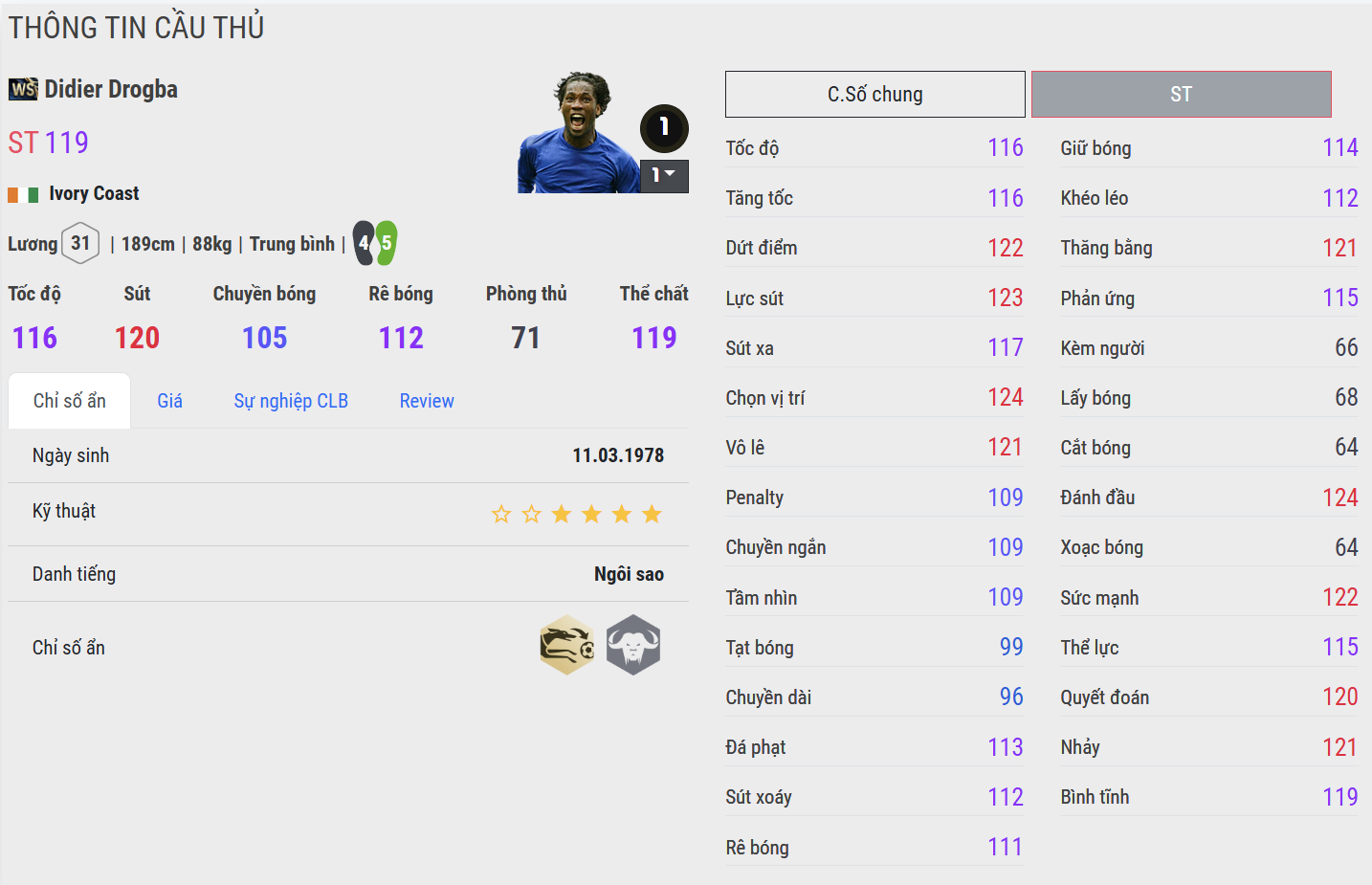 WS: Tì đè rất chắc, thân người đầm, giữ bóng tốt trong pha quay lưng và đối đầu trực diện. Không nhiều hậu vệ meta có thể đẩy ngã Drogba WS dễ dàng.