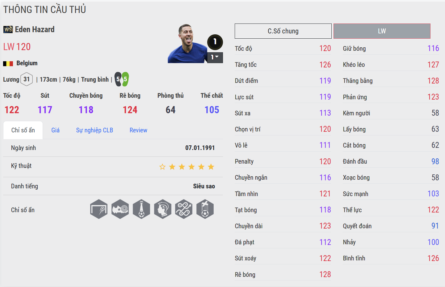 Eden Hazard là hình ảnh của sự mềm mại, ngẫu hứng và chất nghệ sĩ thuần khiết trên sân cỏ – một trong những cầu thủ chạy cánh tài hoa nhất thế hệ của mình. Thời kỳ đỉnh cao tại Chelsea, Hazard khiến cả Premier League phải ngả mũ bằng những pha đi bóng mê hoặc, khả năng giữ thăng bằng phi thường và những cú bứt tốc ngắn khó ai theo kịp.