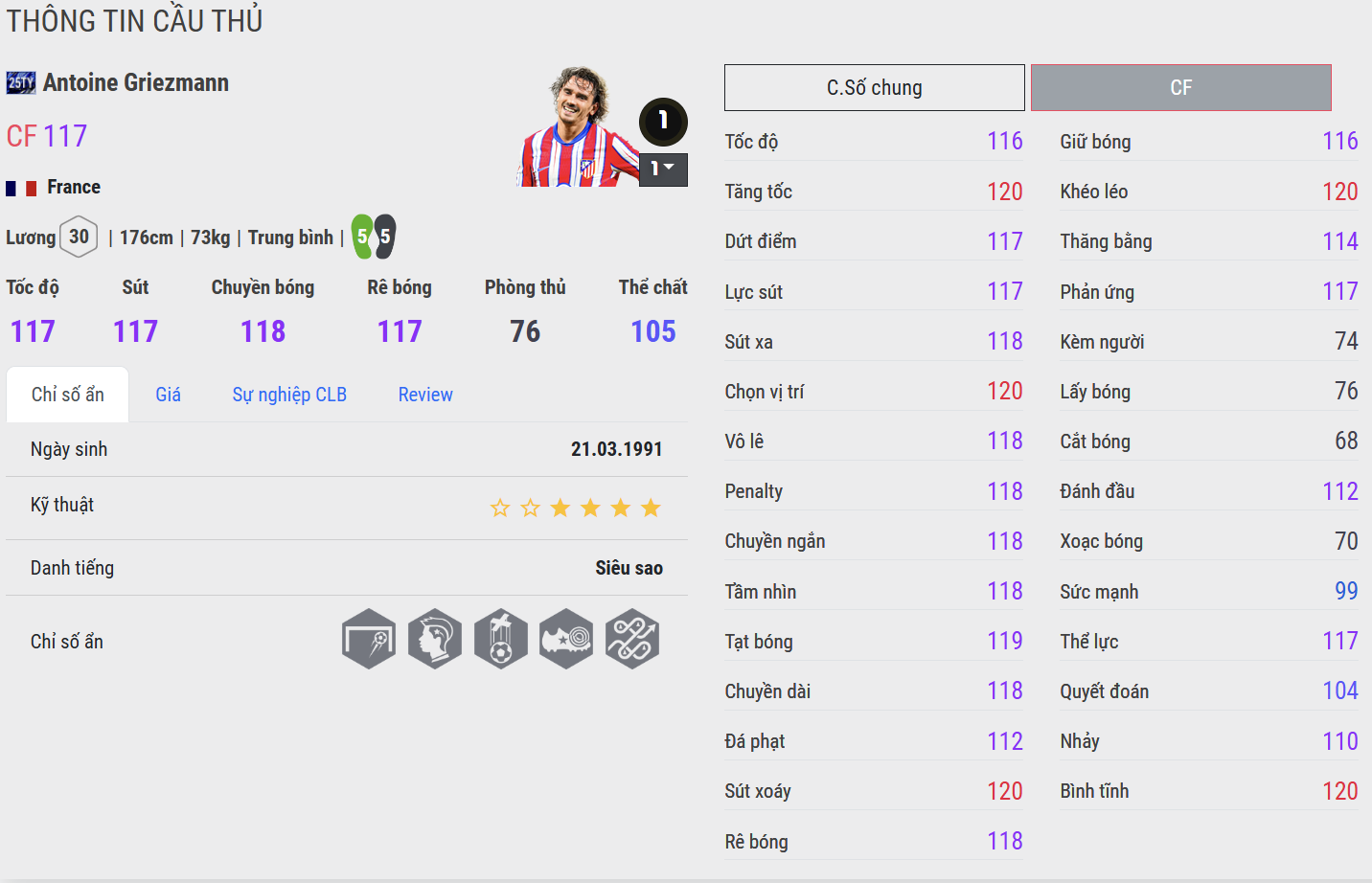 Griezmann mùa 25TOTY là phiên bản được cộng đồng đánh giá rất cao nhờ sự toàn diện trong lối chơi. Khả năng di chuyển linh hoạt, chọn vị trí thông minh cùng bộ chỉ số ẩn hỗ trợ rê dắt và dứt điểm khiến anh trở thành một CF hoặc CAM cực kỳ lợi hại. Ngoài ra, khả năng pressing và tham gia phòng ngự từ xa của Griezmann cũng là điểm cộng lớn giúp tối ưu chiến thuật toàn đội.
