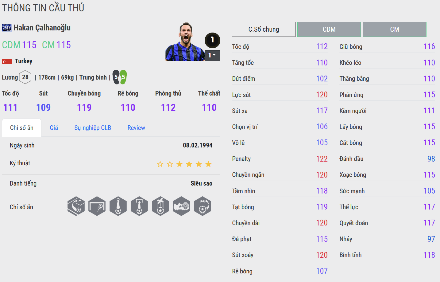 Calhanoglu 25TOTY là một trong những tiền vệ công nguy hiểm nhất của mùa thẻ này. Anh có khả năng sút xa cực mạnh và độ chuẩn xác cao trong các pha đá phạt. Ngoài ra, Calhanoglu còn sở hữu khả năng điều tiết bóng, tung ra những đường chuyền mở biên và mở khoảng cực kỳ tinh tế. Rất phù hợp cho vai trò CAM hoặc CM trong đội hình 4123 hoặc 4231.