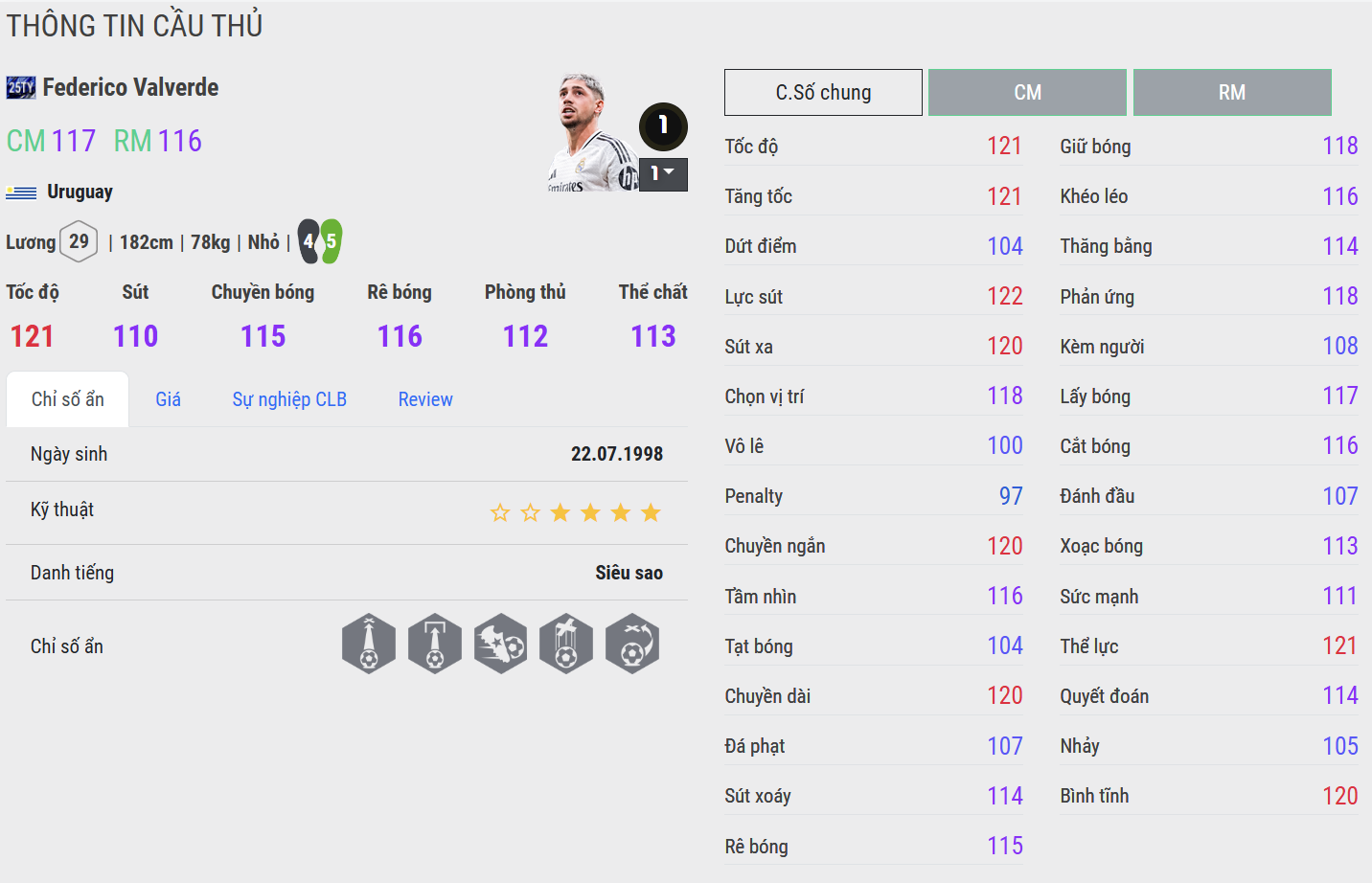 Valverde mùa 25TOTY là cỗ máy hoạt động không biết mệt mỏi nơi tuyến giữa. Với tốc độ, thể lực và khả năng càn quét đáng kinh ngạc, Valverde có thể chơi tốt ở cả vai trò CDM lẫn box-to-box. Điểm mạnh nhất của anh chính là khả năng hỗ trợ phòng ngự cực tốt nhưng vẫn giữ được sự nguy hiểm khi dâng cao tham gia tấn công.