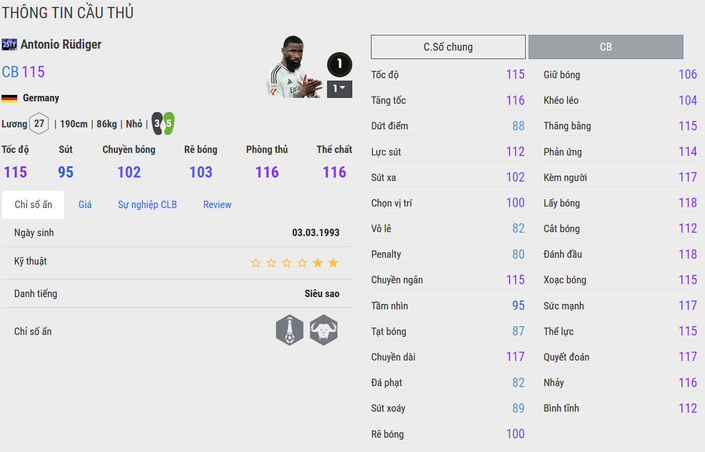 Vị trí số 1 không ai khác ngoài Antonio Rudiger – trung vệ được đánh giá toàn diện bậc nhất mùa 25TOTY. Sức mạnh, tốc độ, khả năng tì đè và cắt bóng của Rüdiger khiến anh trở thành bức tường thép khó xuyên thủng. Ngoài ra, chỉ số ẩn "Chặn bóng" và "Lãnh đạo" giúp tăng độ tin cậy trong các pha đối mặt. Đây là lựa chọn hàng đầu cho hàng thủ nếu bạn cần một trung vệ mạnh mẽ, quyết đoán.