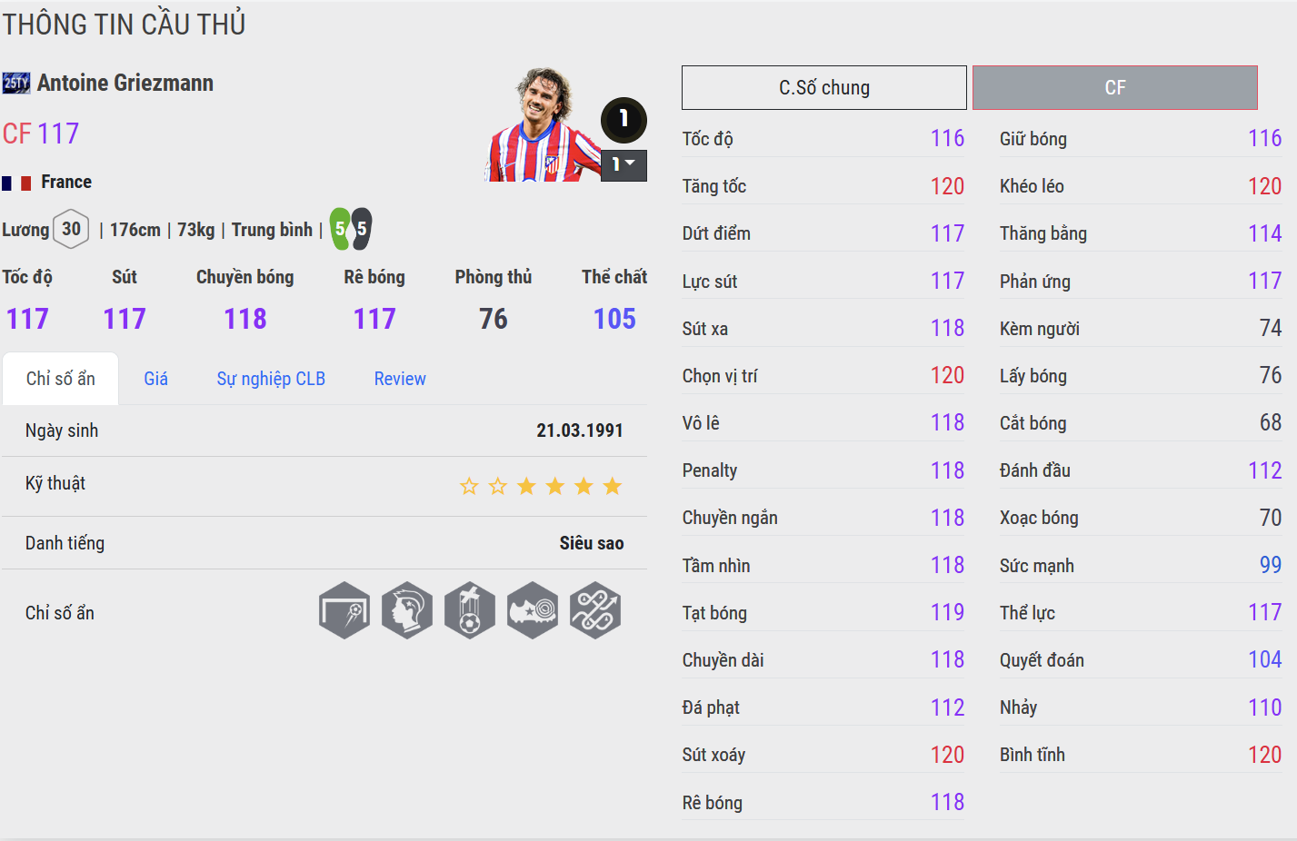Griezmann được nâng cấp lên 2 chân 5 sao, điều này giúp cho giá trị của cầu thủ này tăng vọt khi vốn dĩ anh đã là mẫu hộ công cực kì đa năng, vừa có thể kiến tạo, vừa có thể ghi bàn lại còn có thể thi đấu cả ở hành lang cánh cực kì uy tín.