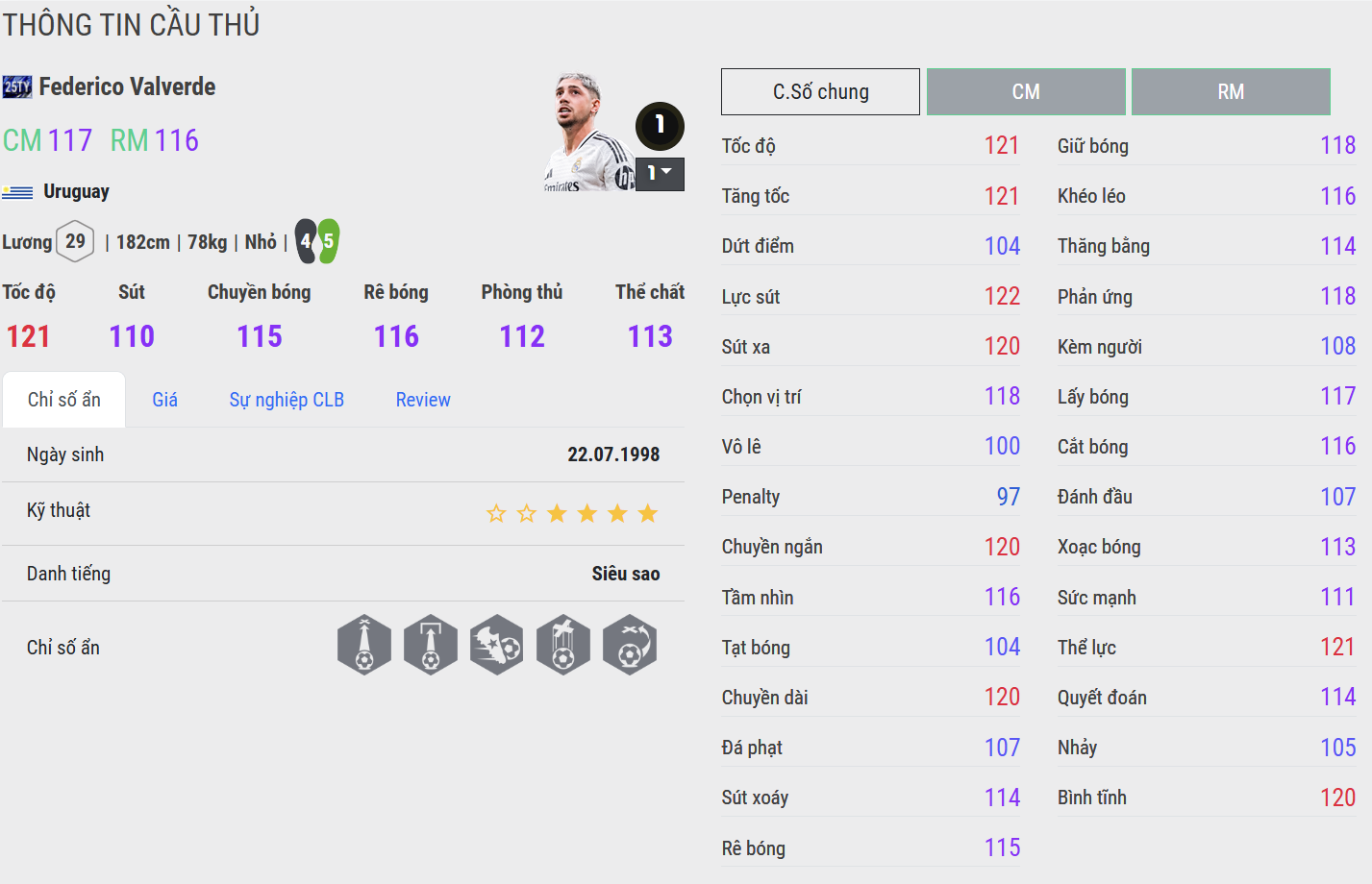 Một trong những tiền vệ trung tâm quốc dân mới mà nhiều game thủ đánh giá rất cao. Sở hữu kĩ năng chuyền bóng xuất sắc, được buff khả năng phòng ngự cực ổn và đặc biệt là khả năng sút rất uy tín với cả 2 chân từ sút xa, ZD đều có lực căng, đường bóng xoáy và tỉ lệ thành bàn ấn tượng.
