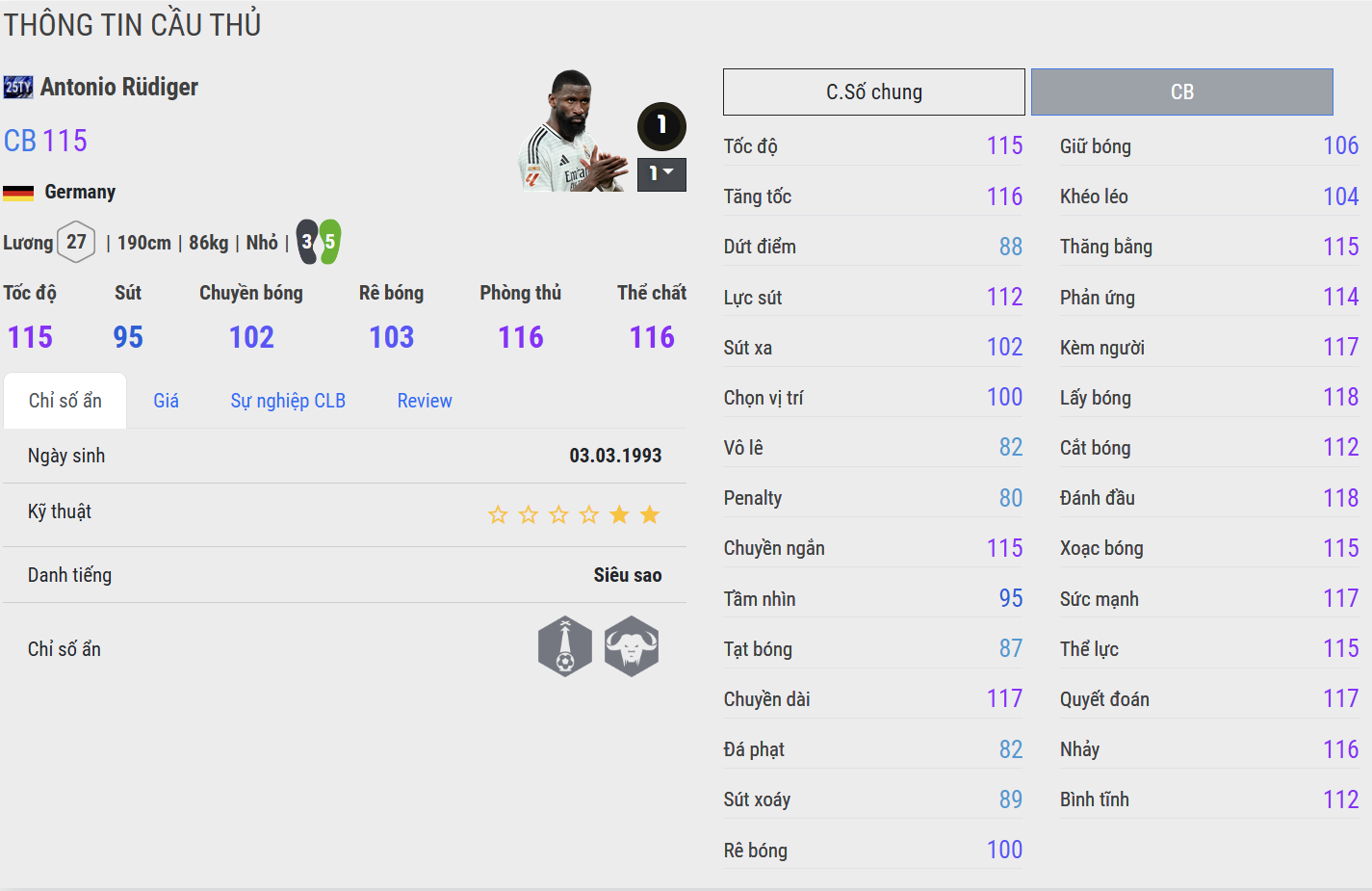 Rudiger vẫn là một trong những trung vệ quốc dân hàng đầu của FC Online. Trong đó, mùa thẻ 25TY tiếp tục được xem là một bản nâng cấp chất lượng cảu trung vệ người Đức. Tốc độ, kỹ năng phòng ngự, tắc bóng, không chiến đều là những điểm nổi bật giúp Rudiger duy trì được vị thế là cầu thủ được dùng nhiều hàng đầu game ở hàng phòng ngự.