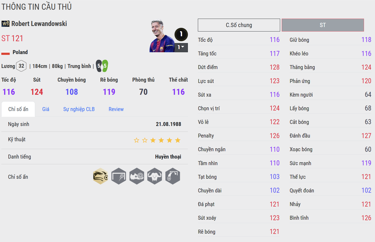 Trung phong người Ba Lan tái hiện hình ảnh của một “cỗ máy ghi bàn” với khả năng chọn vị trí chuẩn xác và dứt điểm đa dạng. Lewandowski WS là sự lựa chọn lý tưởng cho lối chơi thiên về sức mạnh và tính ổn định.
