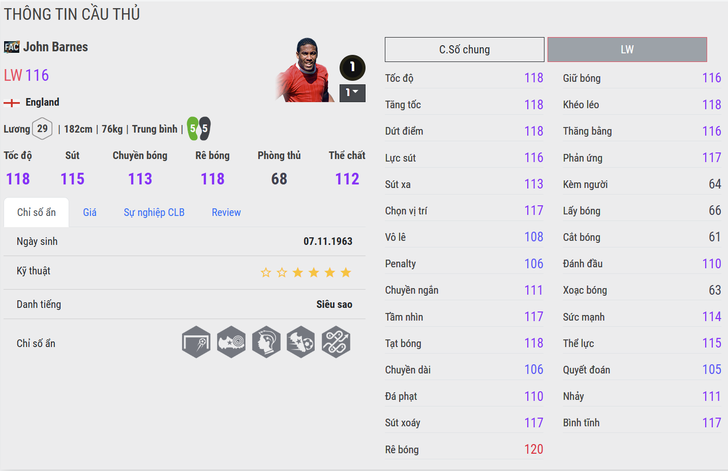 Barnes FAC là hình ảnh của sức mạnh và tốc độ thuần chất bên cánh trái. Anh di chuyển nhanh, rê bóng mềm mại và liên tục tìm khoảng trống để xâm nhập vòng cấm. Trong gameplay, Barnes tạo cảm giác “luôn nguy hiểm” – các pha bứt tốc hay phối hợp ngắn của anh đều dễ dàng khai thác khoảng trống, mang đến những pha đột phá hiệu quả.