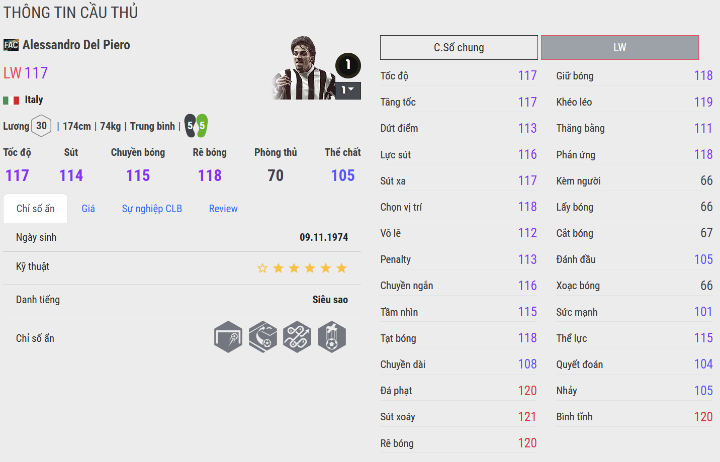 Del Piero FAC là mẫu cầu thủ khéo léo và thông minh. Anh sở hữu những pha xử lý tinh tế, rê bóng mềm mại và khả năng chọn vị trí cực kỳ chuẩn xác. Gameplay cho thấy Del Piero luôn xuất hiện đúng lúc, vừa kiến tạo vừa trực tiếp tạo cơ hội ghi bàn, đặc biệt hiệu quả trong các tình huống phối hợp nhỏ hoặc bứt tốc cắt vào trung lộ.
