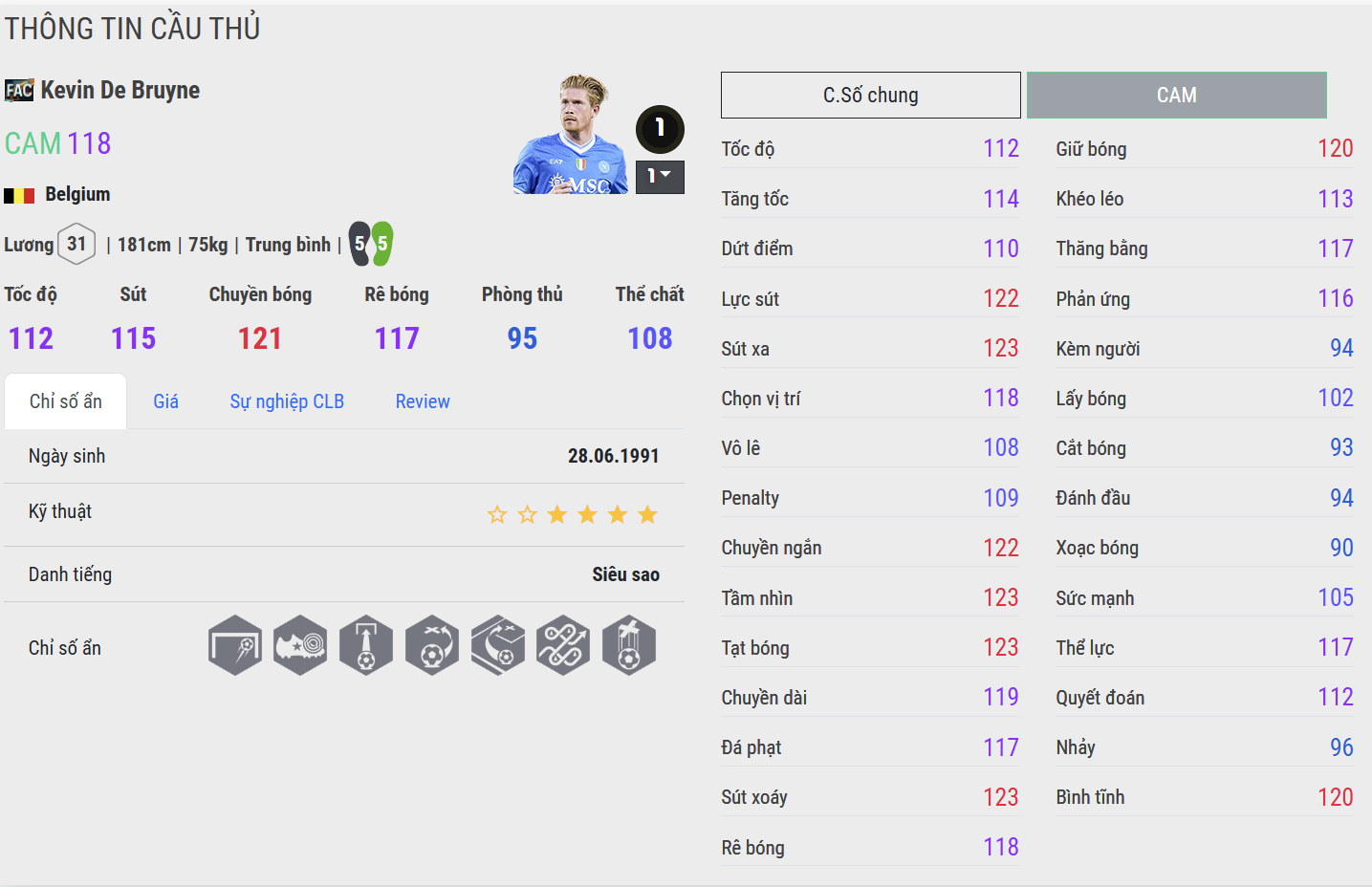 De Bruyne FAC là hiện thân của “bộ não sáng tạo” hiện đại. Khả năng chuyền bóng tầm xa, chọc khe sắc sảo và dứt điểm uy lực biến anh thành mối đe dọa thường trực cho mọi hàng thủ. Gameplay thể hiện De Bruyne luôn kiểm soát nhịp độ trận đấu, dẫn dắt các tình huống tấn công và mở ra cơ hội quyết định với độ chính xác gần như hoàn hảo.