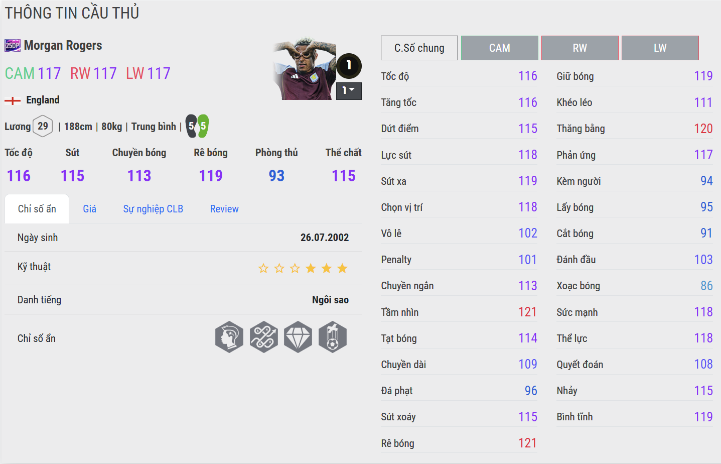 Rogers 25DP mang đến hình ảnh của một CAM trẻ trung, giàu năng lượng và thi đấu bằng bản năng. Anh sở hữu tốc độ bứt phá tốt, khả năng rê bóng linh hoạt cùng những pha xử lý táo bạo trong phạm vi hẹp. Trong gameplay, Rogers tạo cảm giác tươi mới và khó lường – luôn sẵn sàng đột nhập vòng cấm hoặc tung ra đường chuyền mở toang hàng thủ. Dù chưa đạt độ “chín” như các đàn anh, anh vẫn là lựa chọn tiềm năng cho những HLV ưa lối đá tốc độ và trực diện.