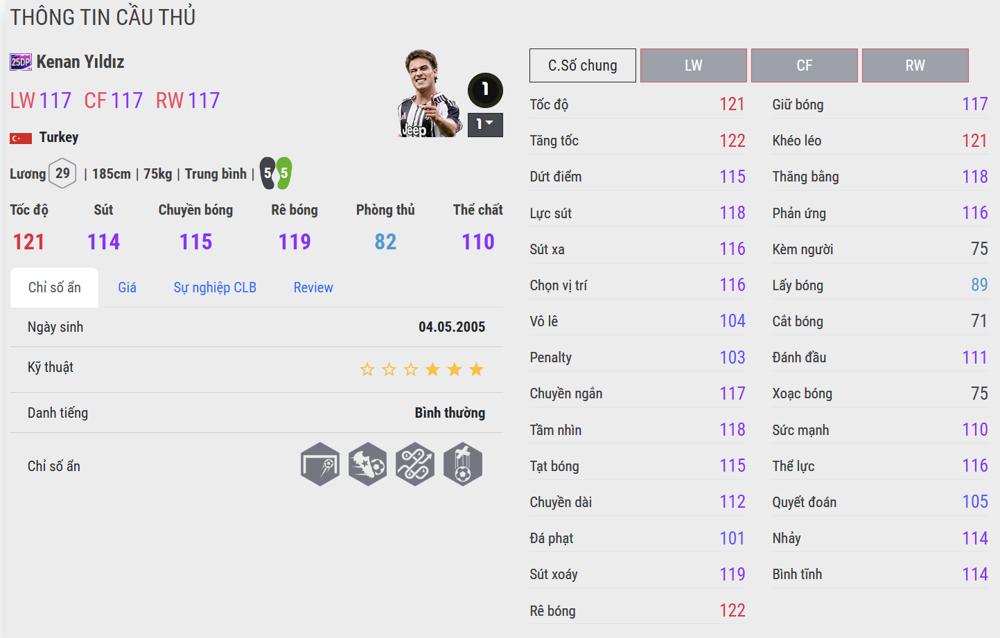 Yildiz 25DP là làn gió mới của thế hệ CAM hiện đại – giàu kỹ thuật, dám cầm bóng và luôn hướng về phía trước. Anh có khả năng rê dắt mềm mại, xử lý bóng nhanh và dứt điểm tinh tế. Trong gameplay, Yildiz thể hiện sự tự tin ở từng pha chạm, luôn sẵn sàng tạo ra khoảnh khắc đột biến bằng cú sút bất ngờ hoặc pha xử lý ảo diệu. Một CAM mang tinh thần trẻ, khát vọng lớn và tiềm năng trở thành biểu tượng mới của dòng thẻ Devoted Players.