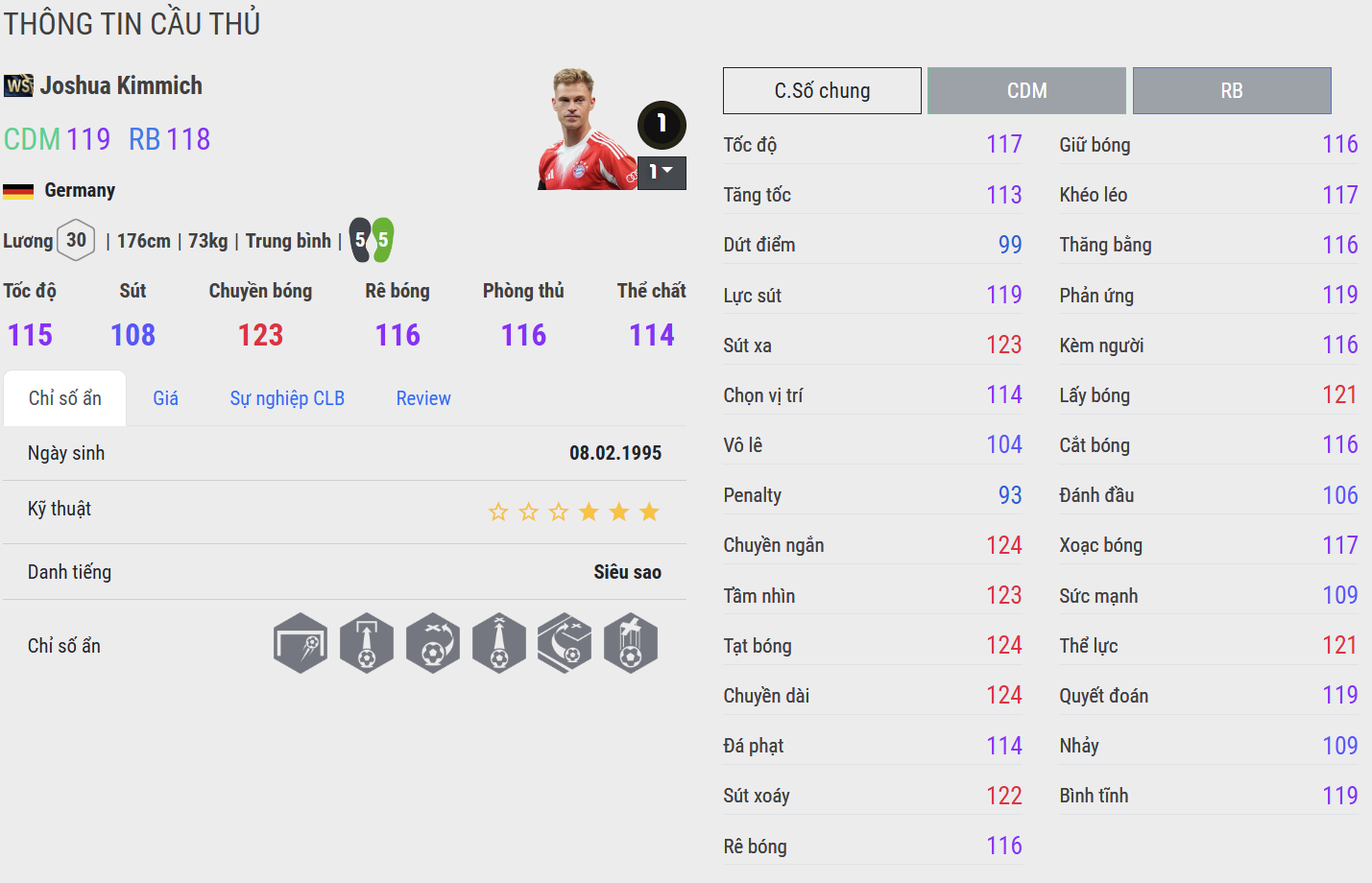 Kimmich WS là mẫu CDM/nhạc trưởng lùi sâu cực đa năng: tầm nhìn chuyền bóng, khả năng phối hợp và đọc trận đều ở mức top. Anh vừa có thể làm regista (phát động), vừa đảm nhiệm nhiệm vụ phòng ngự nhờ khả năng xoạc và vị trí tốt. Kimmich phù hợp cho đội kiểm soát bóng, chuyển trạng thái mượt — kết hợp với một tiền vệ “cào” mạnh mẽ sẽ tối ưu hoá hiệu quả của anh.
