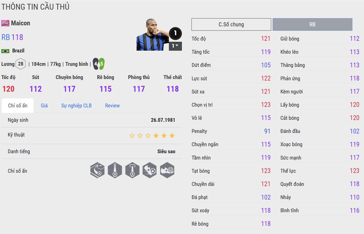 Maicon 25HR mang đến sự đa năng và toàn diện hiếm có. Anh sở hữu tốc độ tốt, khả năng tranh chấp mạnh mẽ và tầm hoạt động rộng, giúp che chắn hiệu quả trước hàng hậu vệ. Trong gameplay, Maicon không chỉ đánh chặn quyết liệt mà còn phát động tấn công mượt mà, đem lại sự cân bằng lý tưởng cho tuyến giữa.