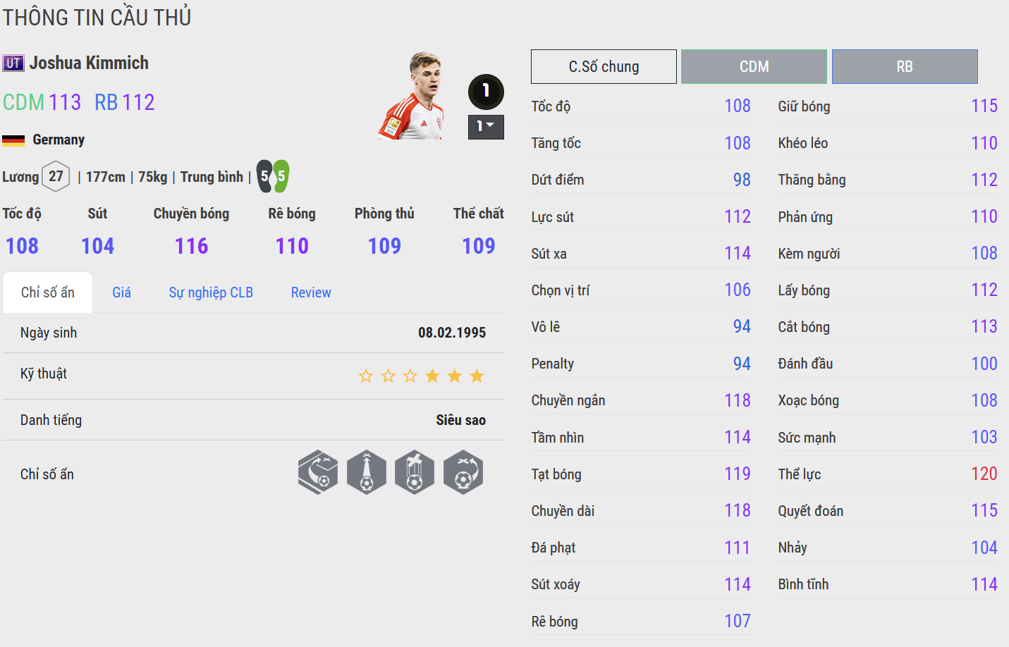 Kimmich UT là mẫu CDM thiên về kiểm soát và phân phối bóng. Anh có tầm nhìn chiến thuật sắc bén, khả năng chuyền bóng đa dạng và khả năng đọc tình huống cực kỳ thông minh. Trong gameplay, Kimmich nổi bật ở khả năng giữ nhịp, điều tiết lối chơi và tạo sự kết nối chặt chẽ giữa các tuyến.