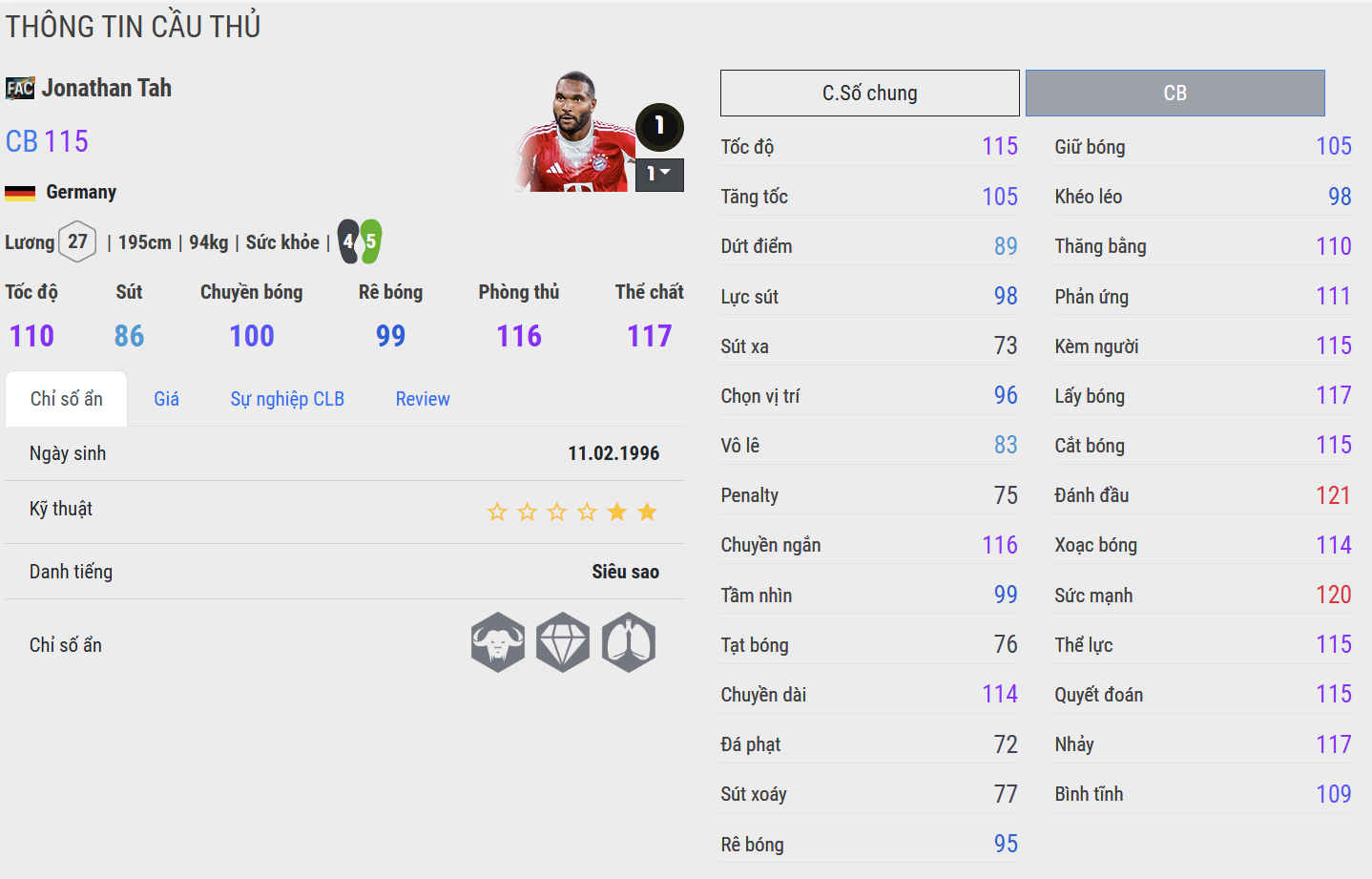 Tah FAC là mẫu trung vệ “khổng lồ” nhưng có độ linh hoạt đáng ngạc nhiên. Anh sở hữu vóc dáng lực lưỡng, bán kính tranh chấp rộng và khả năng xoay trở khá nhanh so với thể hình đồ sộ. Điều khiến Tah nổi bật là những pha cắt bóng rất gọn và cảm giác chọn vị trí chính xác, giúp anh làm chủ khu vực vòng cấm. Trong gameplay, Tah cho thấy sự vững vàng trong không chiến, hỗ trợ bọc lót cực tốt, phù hợp với các đội hình ưu tiên sự an toàn và kỷ luật.