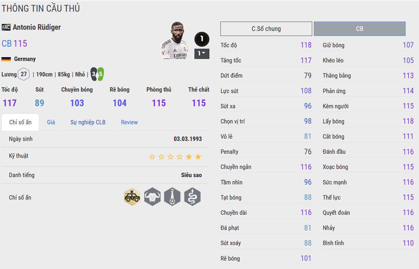 Rüdiger FAC là hiện thân của sự máu lửa, tốc độ và sức mạnh thuần khiết. Anh sở hữu những pha lao cản đầy quyết đoán, khả năng áp sát nhanh và chống phản công cực tốt. Khi đối đầu các tiền đạo tốc độ hoặc kỹ thuật, Rüdiger cho thấy độ “lỳ” rất khó chịu, thường xuyên thắng các pha đua tốc độ lẫn tranh chấp tầm cao. Không chỉ phòng ngự mạnh mẽ, khả năng phát bóng dài của anh cũng khá ổn, phù hợp với lối chơi chuyển trạng thái nhanh.