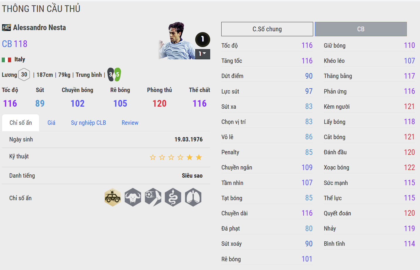Nesta FAC mang phong thái của một bậc thầy phòng ngự: bình tĩnh, thông minh và đọc tình huống sắc bén. Anh không cần quá nhiều sức để tranh chấp mà thường giải quyết bằng những pha cắt bóng chuẩn xác đến mức “tối giản”. Đặc biệt, khả năng xoay trở của Nesta rất tốt, tạo lợi thế trong việc đối đầu với các mẫu tiền đạo nhanh nhẹn. Trong gameplay, Nesta thể hiện sự chắc chắn đáng tin cậy, đứng đúng chỗ, xử lý đúng lúc – một lựa chọn đẳng cấp cho những người chơi đề cao sự tinh tế trong phòng ngự.