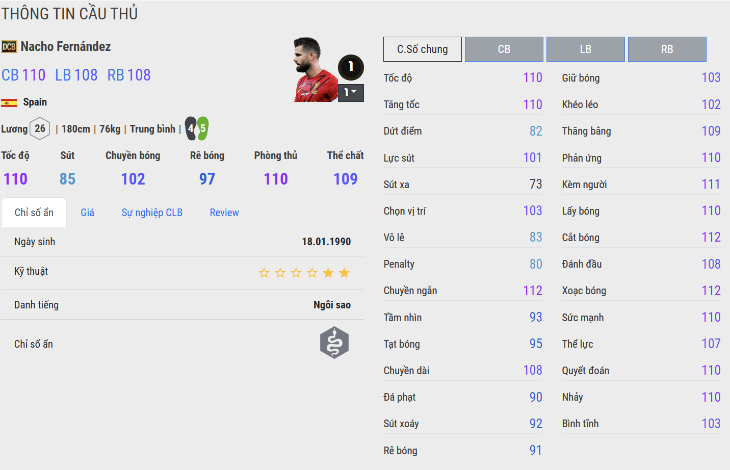 Nacho DCB là trung vệ mang đến sự chắc chắn và bền bỉ. Anh không quá nổi bật ở thể hình hay sức mạnh, nhưng lại sở hữu khả năng xoay trở nhanh nhẹn, bắt bài khôn ngoan và kỷ luật chiến thuật cao. Trong gameplay, Nacho phù hợp với những đội hình ưu tiên sự linh hoạt và pressing tầm cao.