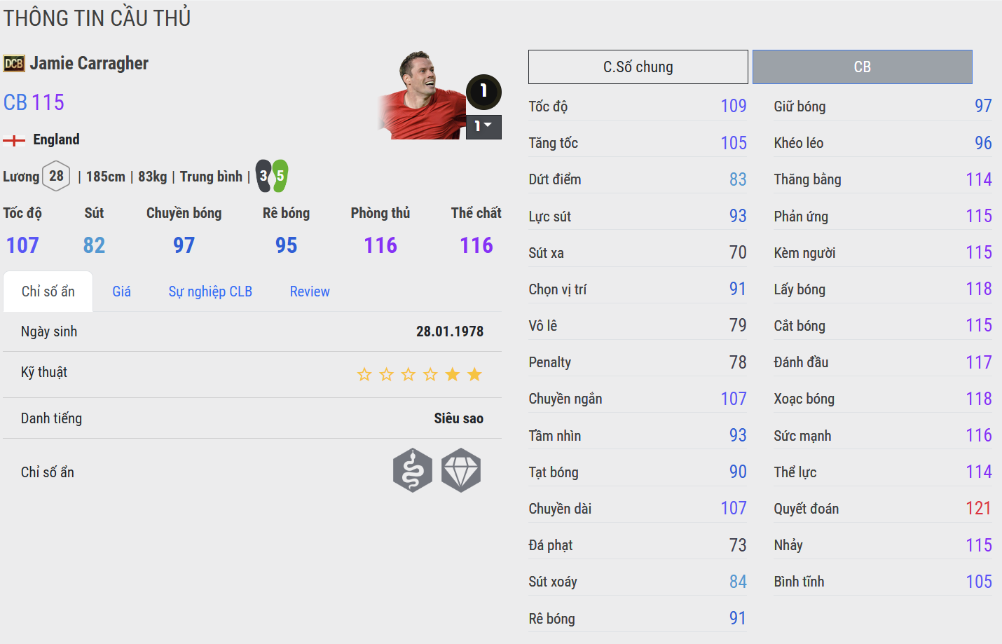 Carragher DCB là hình mẫu trung vệ “cần cù và quả cảm”. Anh không hoa mỹ, nhưng cực kỳ hiệu quả nhờ khả năng tì đè, đọc tình huống chuẩn xác và sự quyết liệt trong từng pha bóng. Trong gameplay, Carragher đem lại cảm giác chắc chắn, luôn sẵn sàng bọc lót và chiến đấu hết mình cho hàng thủ.