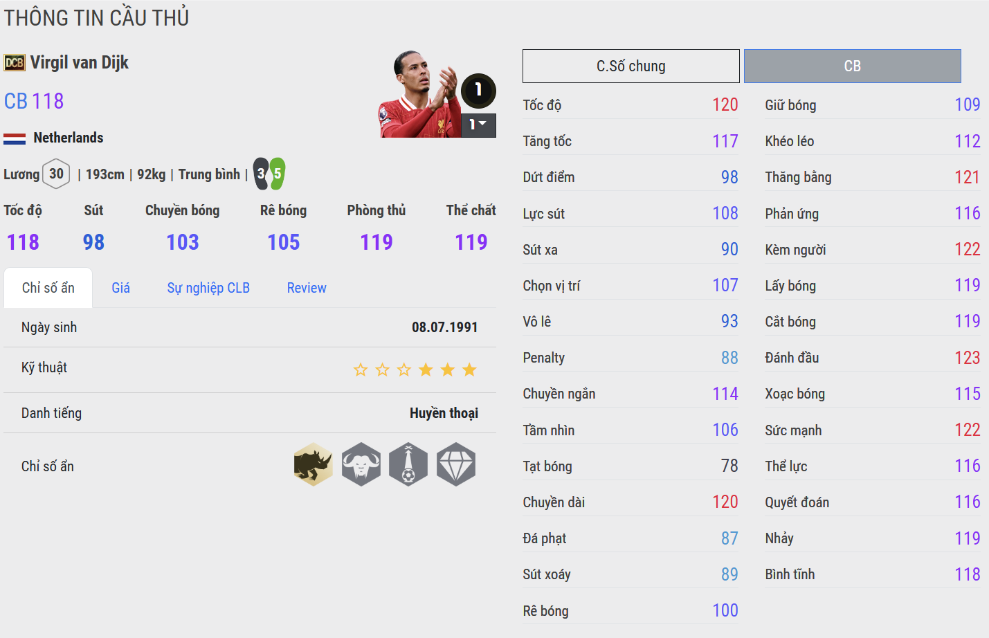 Van Dijk DCB là trung vệ số một của mùa thẻ này. Anh hội tụ đầy đủ mọi phẩm chất: chiều cao, sức mạnh, tốc độ, khả năng không chiến và sự điềm tĩnh hiếm có. Trong gameplay, Van Dijk gần như là “tấm lá chắn bất khả xâm phạm”, khiến mọi tiền đạo phải chùn chân. Đây chính là CB đáng tin cậy nhất để xây dựng hàng thủ chắc chắn.