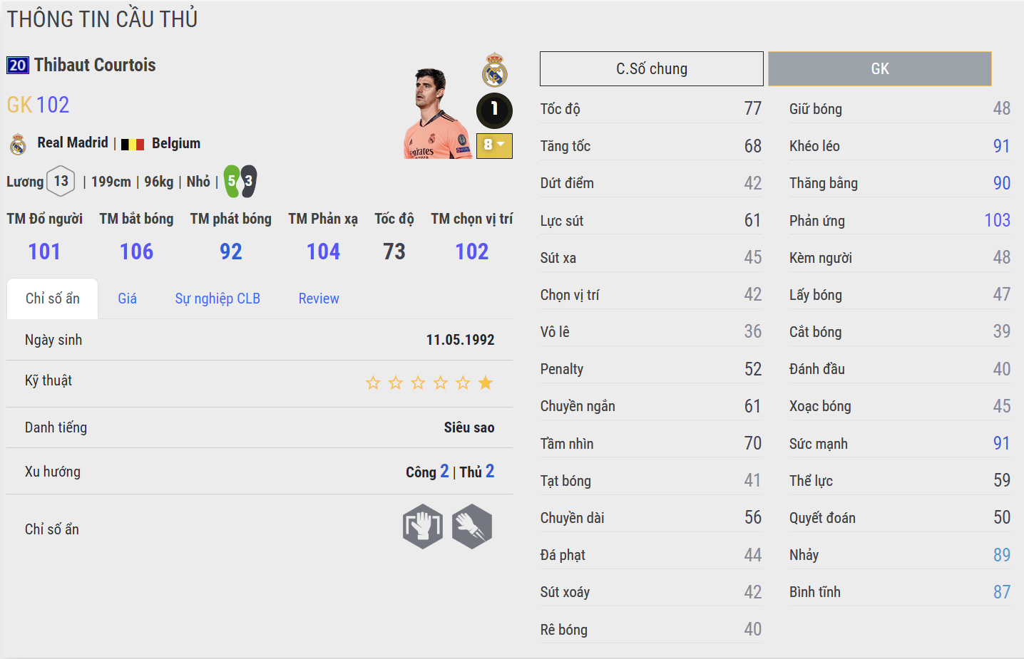 Được xem là thủ môn quốc dân, Courtois là mẫu cầu thủ có giá trị sử dụng ở hầu hết các mùa. Trong đó với mùa thẻ 20UCL, Courtois cho thấy AI bắt bóng rất khôn. Sải tay dài, phản xạ tốt và kỹ năng đổ người nhanh nhạy khiến cho Courtois là một cái tên đáng tin cậy ở trong khung gỗ của đội hình.