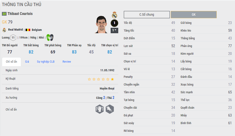 Không ai có thể phủ nhận Thibaut Courtois là một thủ môn tài năng, nhưng đến mức độ tuyệt đối như trong FC Online thì có lẽ ở ngoài đời thủ thành người Bỉ cần phải cố gắng hơn rất nhiều. Với số lượng sử dụng luôn áp đảo hơn 50% số lượng người chơi thì rõ ràng Tourtois là chốt chặn cực kỳ an toàn với các đội bóng. Sải tay dài cùng với 2 team color bá nhất game chính là nguyên nhân khiến cho Courtois luôn là lựa chọn hàng đầu.