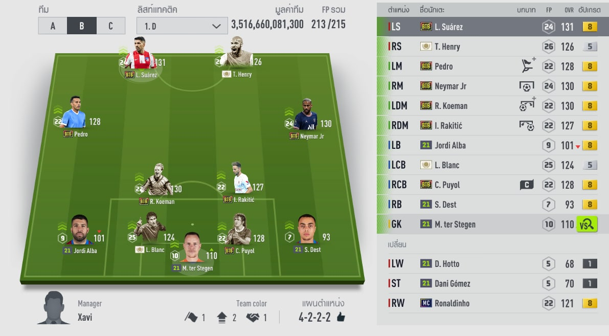 Đây là đội hình khá lạ lùng với đa phần các cule, bởi không Messi. Hai nhân tố đá cánh của 4222 là Pedro và Neymar, hai cầu thủ này quẩy rất nhiệt và có khả năng xuyên phá cánh cực tốt, đặc biệt là hai chân đều 5/5