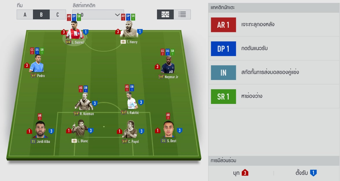Với việc thiết lập DS1 cho tất cả cầu thủ trên hàng công, thể hiện rõ rệt ý đồ của HLV này khi chơi pressing ngay bên phần sân đối phương, điều này cũng là dễ hiểu vì Barca chưa bao giờ được đánh giá là CLB có hệ thống phòng ngự tốt, khi các CDM và CB của họ thường không được đánh giá cao trong game
