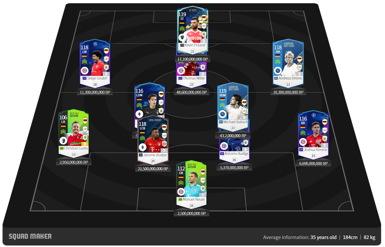 Nhiều người thường chọn sử dụng team Bayern Munich làm nòng cốt khi xây team Đức, bởi đa phần những tinh hoa của bóng đá Đức đều từng khoác áo CLB này. Tuy vậy ở trong game hiện nay, khó có một tiền đạo nào của Bayern có thể chơi tốt ở vị trí trung phong mà lại mang quốc tịch Đức cả. Muller thì phù hợp với vai trò một hộ công hơn. Và cái tên Kevin Volland được chọn, đây cũng là tiền đạo có hiệu suất ghi bàn ổn nhất của Đức trong game.