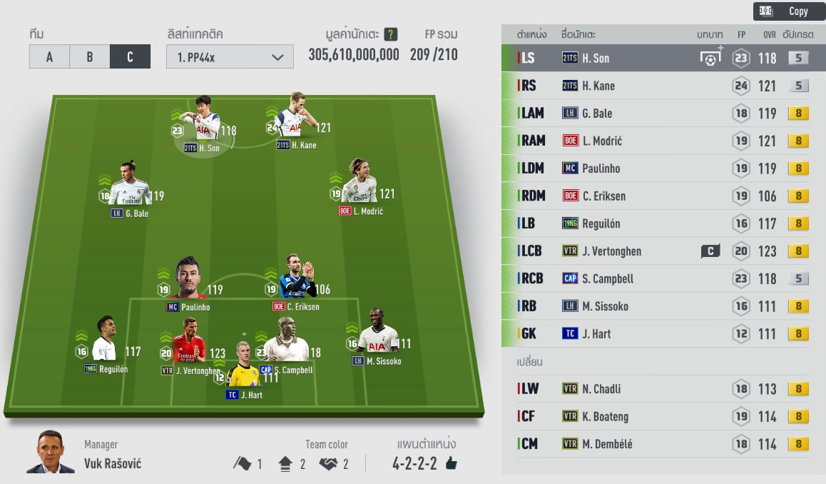 Đây là đội hình của một HLV người Thái Lan dùng để leo rank và cán đích ở vị trí thứ 8 mùa giải trước kết thúc cách đây vài ngày. Với sơ đồ 4222 Tottenham tận dụng được cặp đôi tiền đạo cực tốt của họ ở thời điểm hiện tại trong game là Son Hueng Min và Kane.