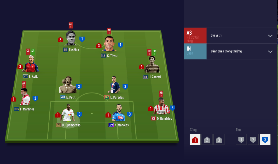 Do có tới 2 cầu thủ tiền đạo, nên bạn luôn ưu tiên một cái tên có chiều cao cũng như thể hình vượt trội với mục đích chuyên trị các pha bóng bổng, còn một cầu thủ có khả năng xâm nhập tốt, tốc độ nhanh.