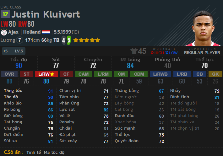 Con trai của huyền thoại Patrick Kluivert cho thấy sự hiệu quả khá cao ở vị trí hành lang cánh trái. Tốc độ, khả năng tăng tốc là rất tốt cùng với đó là sự khéo léo và thăng bằng tốt khiến cầu thủ này rất khó ngã trong các pha bám đuổi và tì đè của hậu vệ đối phương. Khả năng sút của Kluivert cũng là rất tốt đặc biệt là sút xoáy tầm trung.