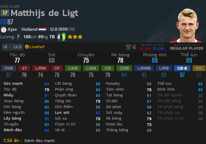 Với độ hot cao khi là một trong những tài năng trẻ đang được quan tâm và săn đón bậc nhất, De Light cho thấy tài năng phòng ngự của mình khi chỉ mới 19 tuổi. Với thể hình cực kì tốt cho vị trí trung vệ kèm theo đánh đầu mạnh và chỉ số sức mạnh cao, De Light chính là vị trí trung vệ bao quát tốt bậc nhất. Không chỉ có khả năng phòng ngự tốt, De Light còn cho thấy sự hiệu quả ở cả việc cầm bóng hay chuyền bóng.Ngoài ra, tốc độ của De Ligt cũng là khá tốt với một mẫu trung vệ có thể hình cao to như vậy.