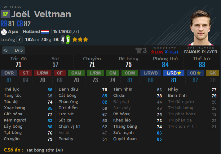 Có tốc độ chỉ ở mức trung bình so với vị trí hậu vệ cánh tuy nhiên bù lại Khả năng phòng ngự của Veltman rất tốt và anh cũng ít khi dâng quá cao. Sức mạnh tốt và vóc dáng lý tưởng khiến cho anh chàng này vô cùng mạnh trong những phat tranh chấp tay đôi bên hành lang cánh ngay cả khi tốc độ là không cao.