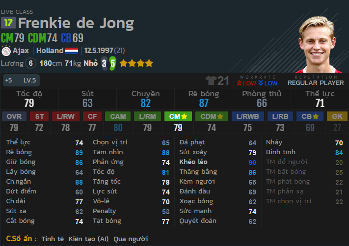 Được các đại gia hàng đầu săn đón như Man U, Man C, Barcelona. De Jong trong game thể hiện độ hiệu quả tương đối cao đối với vị trí tiền vệ. Khả năng giữ vị trí và hỗ trợ phòng ngự cũng như tấn công là khá tốt. Đặc biêt là De Jong khá mạnh về khoản cầm bóng và điều tiết lối chơi. Đây sẽ là vị trí cốt lõi cho lối chơi 4-3-3